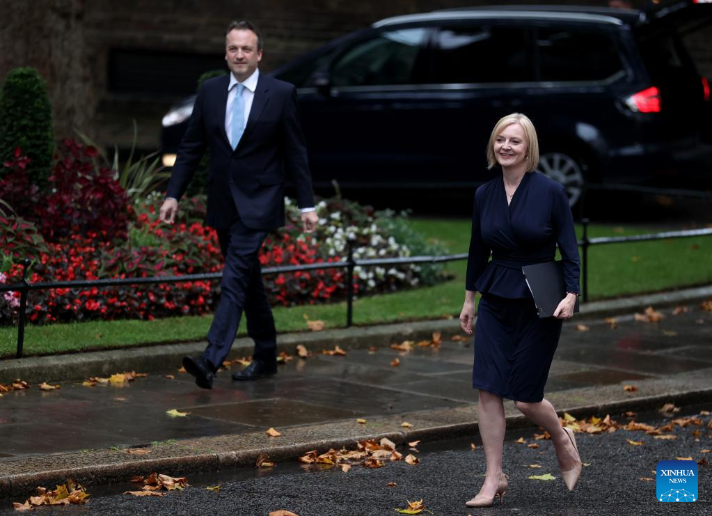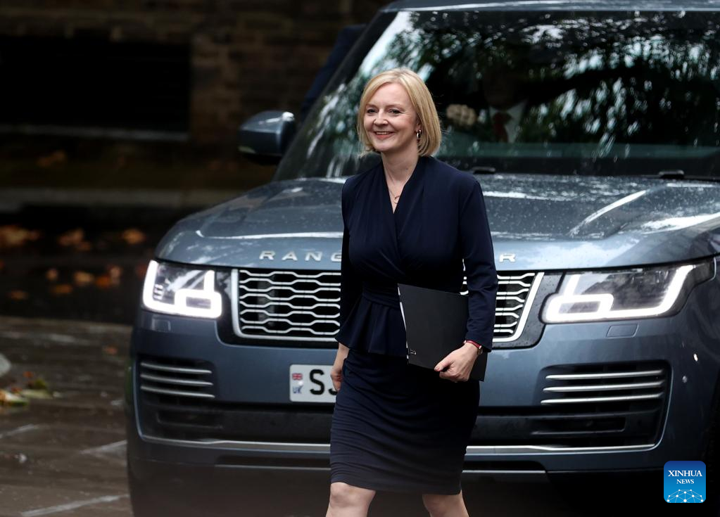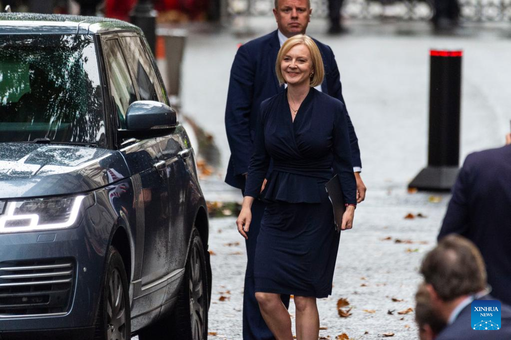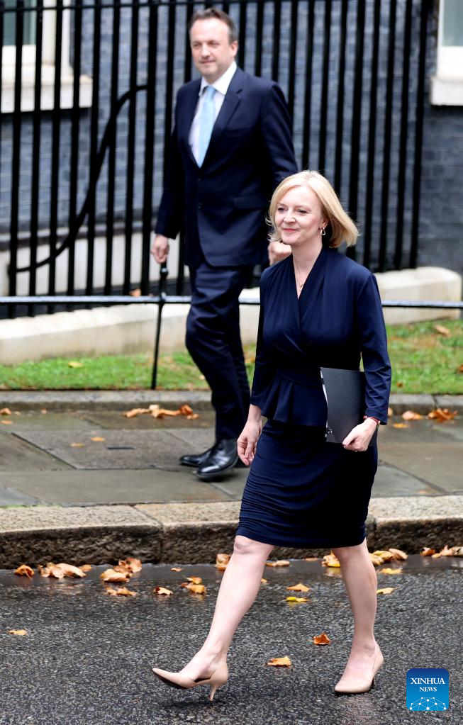 Britain's new Prime Minister Liz Truss (front) arrives to deliver her first address to the nation outside 10 Downing Street in London, Britain, on Sept. 6, 2022. Britain's new Prime Minister Liz Truss said on Tuesday that she will prioritize economic growth, tackling the energy crisis and improving access to the health service. (Xinhua/Li Ying)