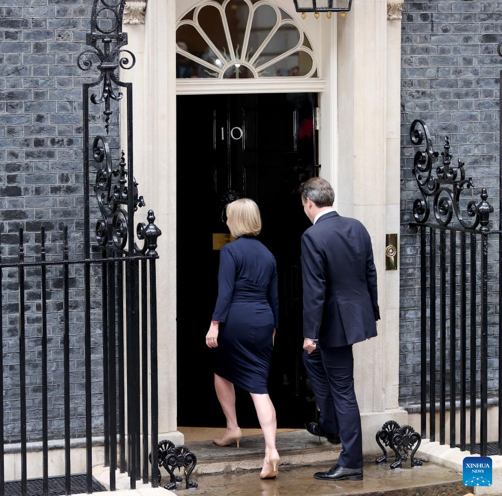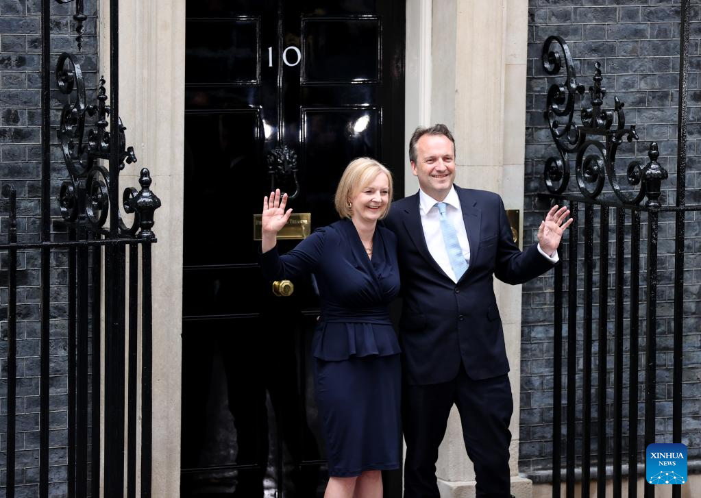 Britain's new Prime Minister Liz Truss (R) arrives to deliver her first address to the nation outside 10 Downing Street in London, Britain, on Sept. 6, 2022. Britain's new Prime Minister Liz Truss said on Tuesday that she will prioritize economic growth, tackling the energy crisis and improving access to the health service. (Xinhua/Li Ying)