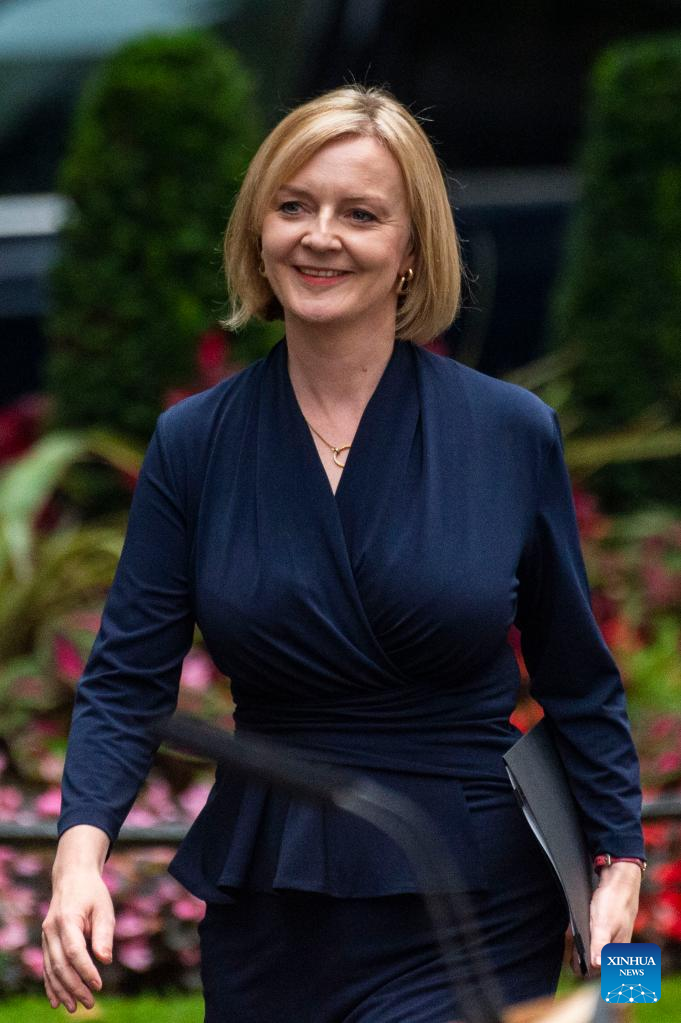 Britain's new Prime Minister Liz Truss arrives to deliver her first address to the nation outside 10 Downing Street in London, Britain, on Sept. 6, 2022. Britain's new Prime Minister Liz Truss said on Tuesday that she will prioritize economic growth, tackling the energy crisis and improving access to the health service. (Xinhua/Li Ying)