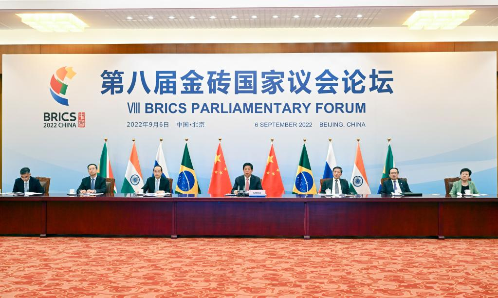 Li Zhanshu, chairman of the National People's Congress (NPC) Standing Committee, presides over a BRICS parliamentary forum and addresses the forum via video link at the Great Hall of the People in Beijing, capital of China, Sept. 6, 2022. (Xinhua/Zhang Ling)