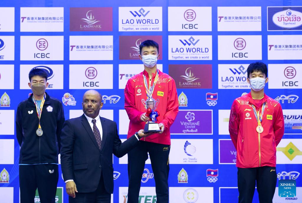 Chen Yuanyu (2nd R) of China poses during the awarding ceremony of Junior Boys' Singles Final at 26th Asian Junior and Cadet Table Tennis Championships (AJCC) in Vientiane, Laos, Sept. 6, 2022. China won two gold medals in Junior Boys' Singles and Junior Girls' Singles on Tuesday, having previously collected three golds in the Junior Boys, Junior Girls and Cadet Boys. (Photo by Kaikeo Saiyasane/Xinhua)