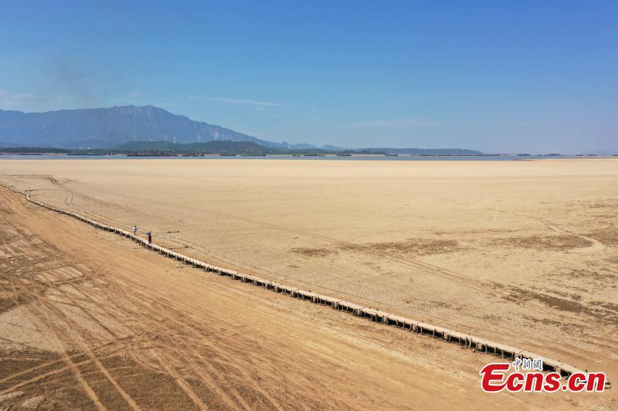 The 2,657-metre-long bridge built in Ming Dynasty (1368-1644) reappears as the water level continued to drop at Poyang Lake, Jiujiang city, east China's Jiangxi Province, Sept. 6, 2022. (Photo: China News Service/Liu Zhankun)