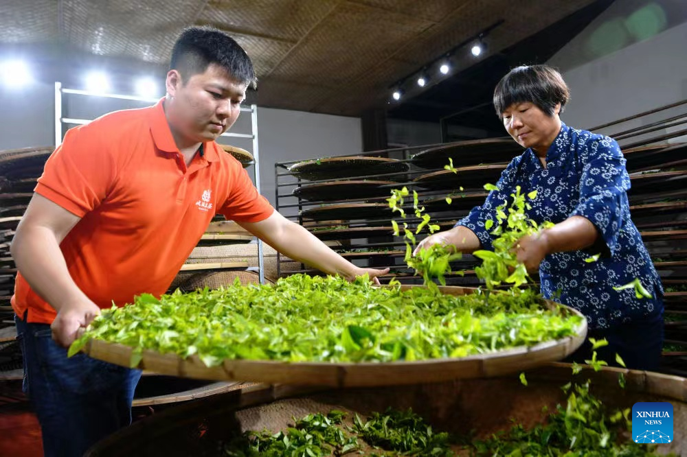 Fang Zhou (L) learns to make Wuyi rock tea, a type of oolong tea, from his mother at a workshop in Xingcun Township of the city of Wuyishan, southeast China's Fujian Province, May 10, 2020. (Xinhua/Wei Peiquan)