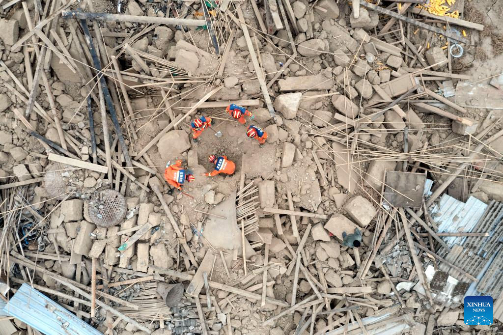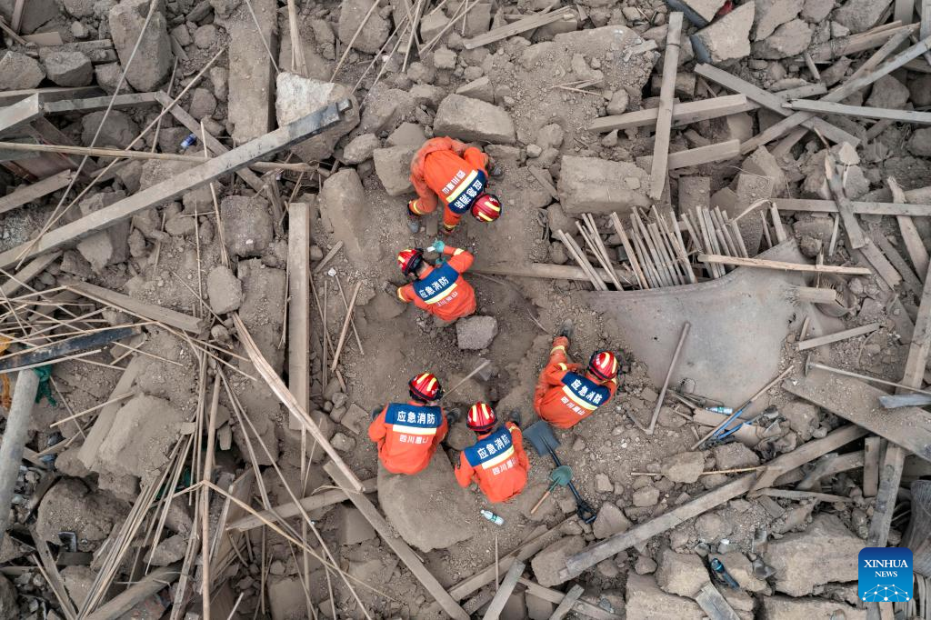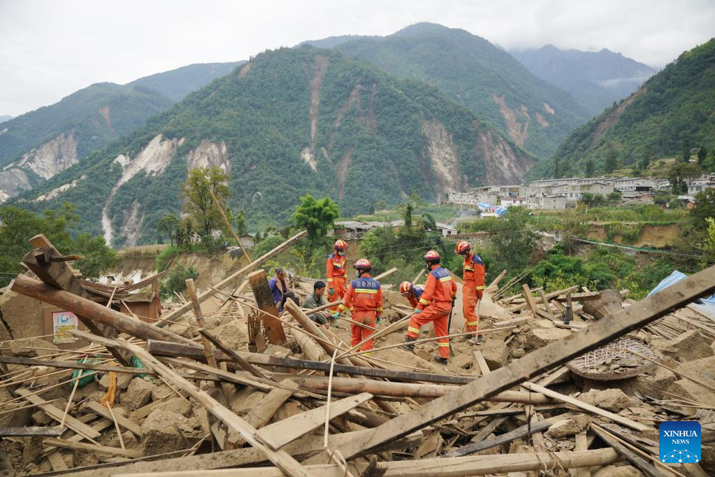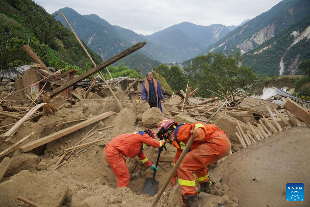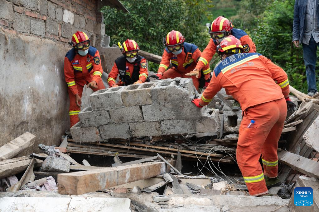 Rescuers clear debris of a house damaged in earthquake in Xingfu Village of Shimian County, southwest China's Sichuan Province, Sept. 7, 2022. A 6.8-magnitude earthquake jolted southwest China's Sichuan Province on Monday, and Shimian County in Ya'an were one of the hardest-hit areas. The quake damaged houses, roads, water conservancy facilities, hydropower stations, and telecommunications.