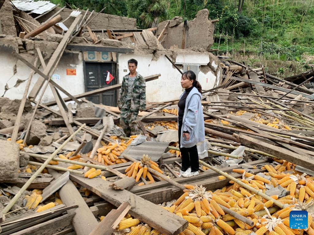Beekeeper couple Kang Beibing (L) and Chen Yun stand in the debris of their damaged house in Xingfu Village of Shimian County, southwest China's Sichuan Province, Sept. 7, 2022. A 6.8-magnitude earthquake jolted southwest China's Sichuan Province on Monday, and Shimian County in Ya'an were one of the hardest-hit areas. The quake damaged houses, roads, water conservancy facilities, hydropower stations, and telecommunications.