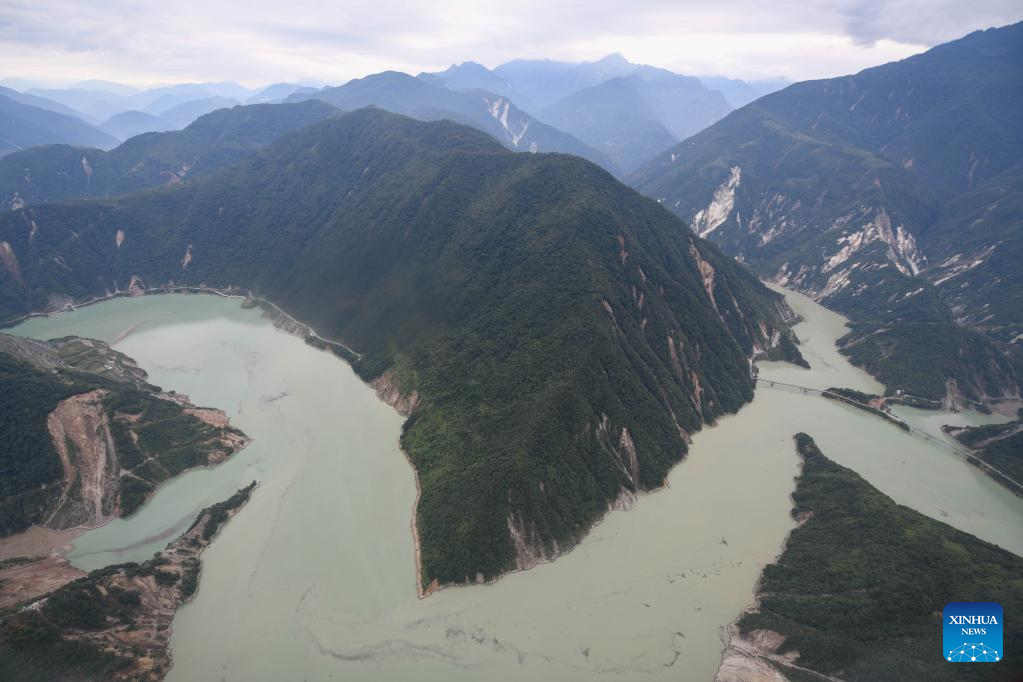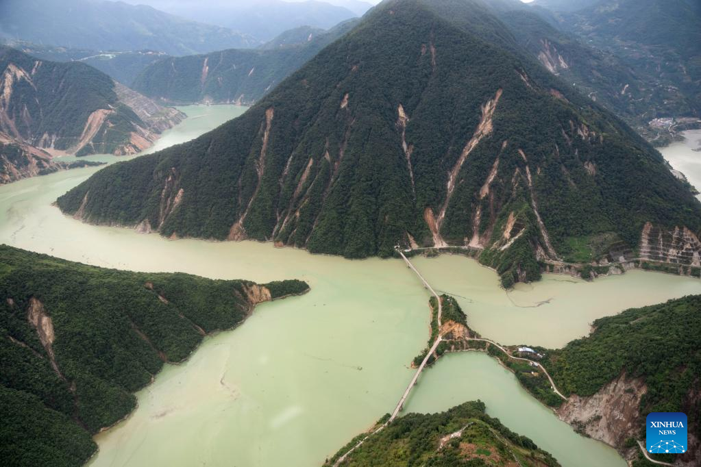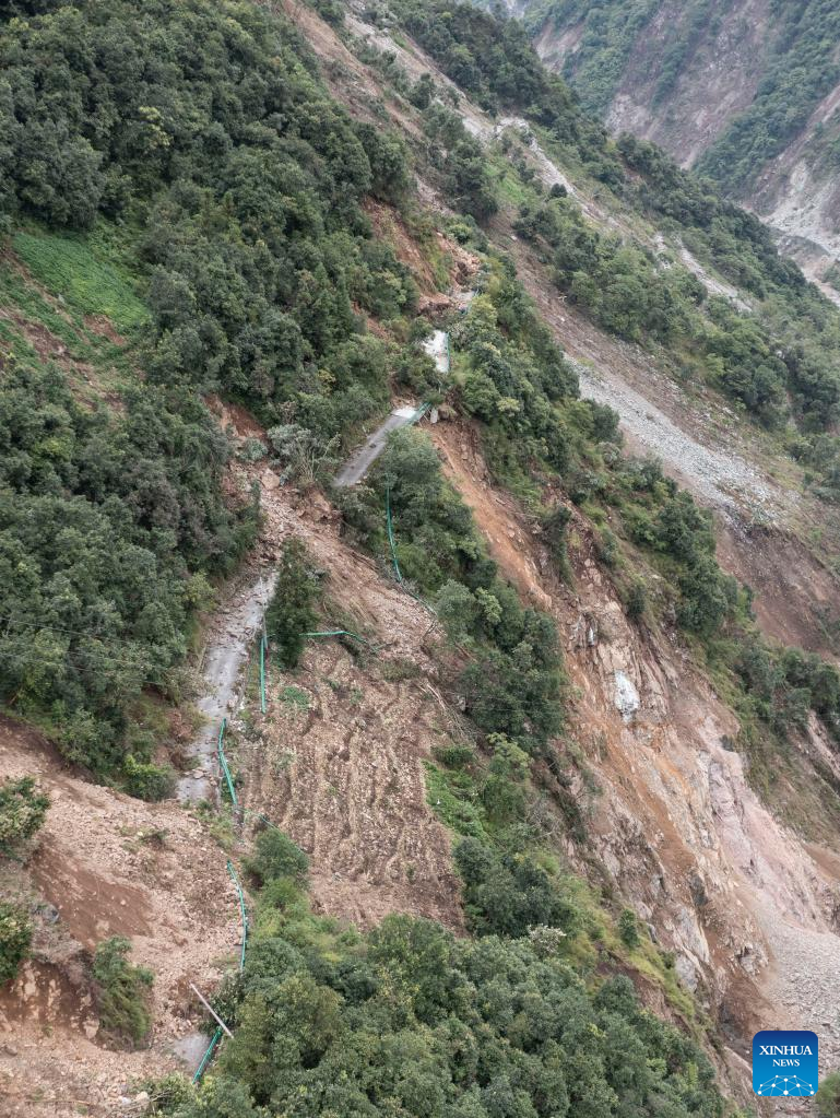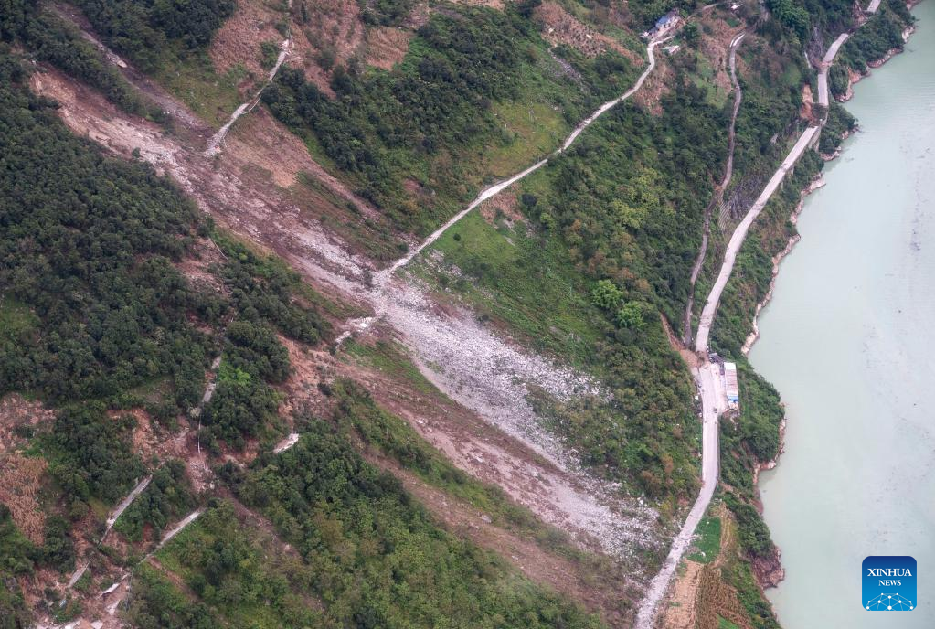 Aerial photo taken on Sept. 7, 2022 shows landslide sites near Xingfu Village of Shimian County, southwest China's Sichuan Province. A 6.8-magnitude earthquake jolted southwest China's Sichuan Province on Monday, and Shimian County in Ya'an were one of the hardest-hit areas. The quake damaged houses, roads, water conservancy facilities, hydropower stations, and telecommunications.