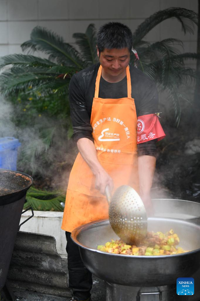 A local villager prepares meal for rescuers at a quake relief shelter in Caoke Township of Shimian County, southwest China's Sichuan Province, Sept. 7, 2022. Rescuers arrived on foot on Tuesday afternoon and successfully opened up a "life channel" for Caoke, a township once lost contact with the outside world due to the severely damaged roads after the earthquake. (Xinhua/Xu Bingjie)