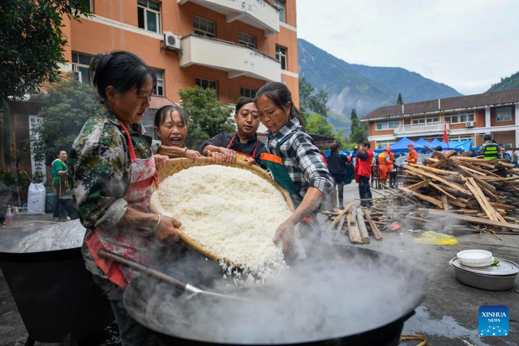 Local residents prepare meal for rescuers at a quake relief shelter in Caoke Township of Shimian County, southwest China's Sichuan Province, Sept. 7, 2022. Rescuers arrived on foot on Tuesday afternoon and successfully opened up a "life channel" for Caoke, a township once lost contact with the outside world due to the severely damaged roads after the earthquake. (Xinhua/Xu Bingjie)