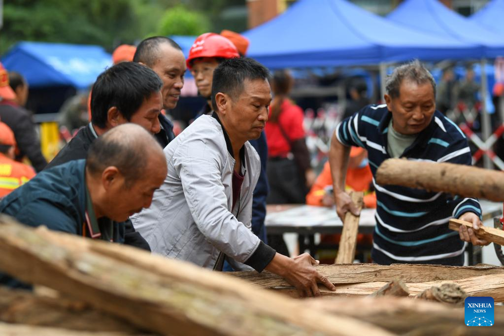 People carry firewood donated by local villagers at a quake relief shelter in Caoke Township of Shimian County, southwest China's Sichuan Province, Sept. 7, 2022. Rescuers arrived on foot on Tuesday afternoon and successfully opened up a "life channel" for Caoke, a township once lost contact with the outside world due to the severely damaged roads after the earthquake. (Xinhua/Xu Bingjie)