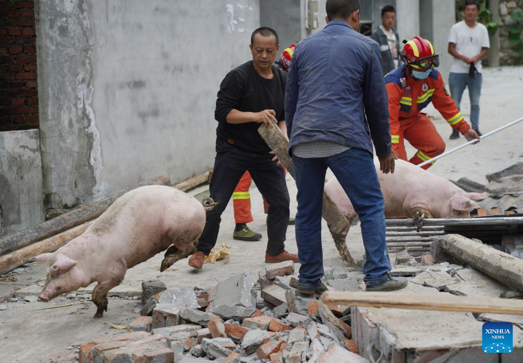 Rescuers and villagers transfer pigs from a damaged pigpen in Xingfu Village of Shimian County, southwest China's Sichuan Province, Sept. 7, 2022. A 6.8-magnitude earthquake jolted southwest China's Sichuan Province on Monday, and Shimian County in Ya'an were one of the hardest-hit areas. The quake damaged houses, roads, water conservancy facilities, hydropower stations, and telecommunications.