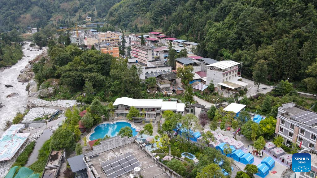 Aerial photo taken on Sept. 7, 2022 shows the tents of quake-affected people in Xingfu Village of Shimian County, southwest China's Sichuan Province.
