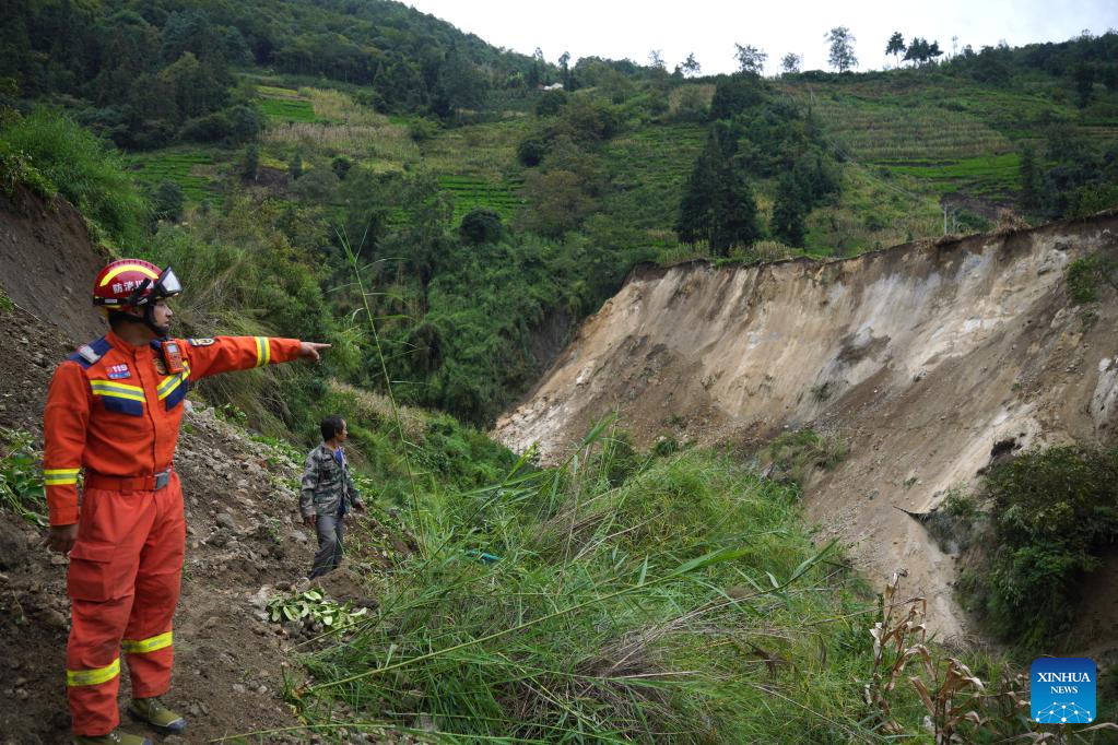 A rescuer points at a landslide site in Shimian County, southwest China's Sichuan Province, Sept. 7, 2022. A 6.8-magnitude earthquake jolted southwest China's Sichuan Province on Monday, and Shimian County in Ya'an were one of the hardest-hit areas. The quake damaged houses, roads, water conservancy facilities, hydropower stations, and telecommunications.