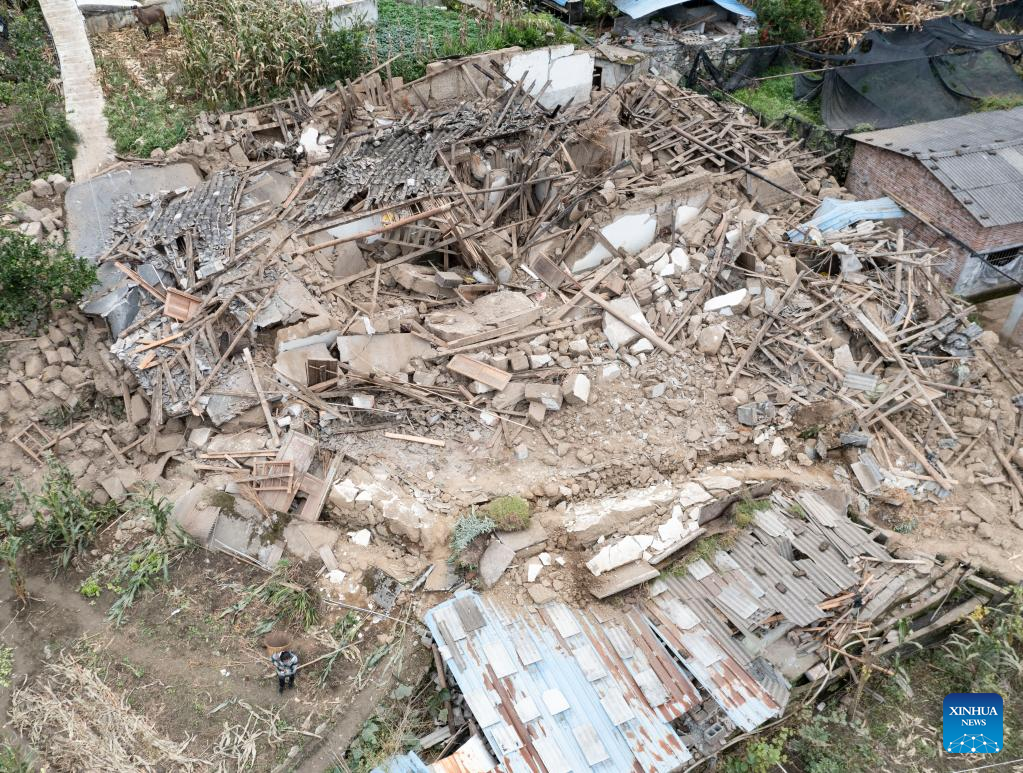 Aerial photo taken on Sept. 7, 2022 shows houses damaged by earthquake in Xingfu Village of Shimian County, southwest China's Sichuan Province. A 6.8-magnitude earthquake jolted southwest China's Sichuan Province on Monday, and Shimian County in Ya'an were one of the hardest-hit areas. The quake damaged houses, roads, water conservancy facilities, hydropower stations, and telecommunications.
