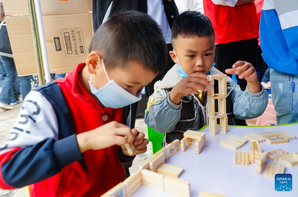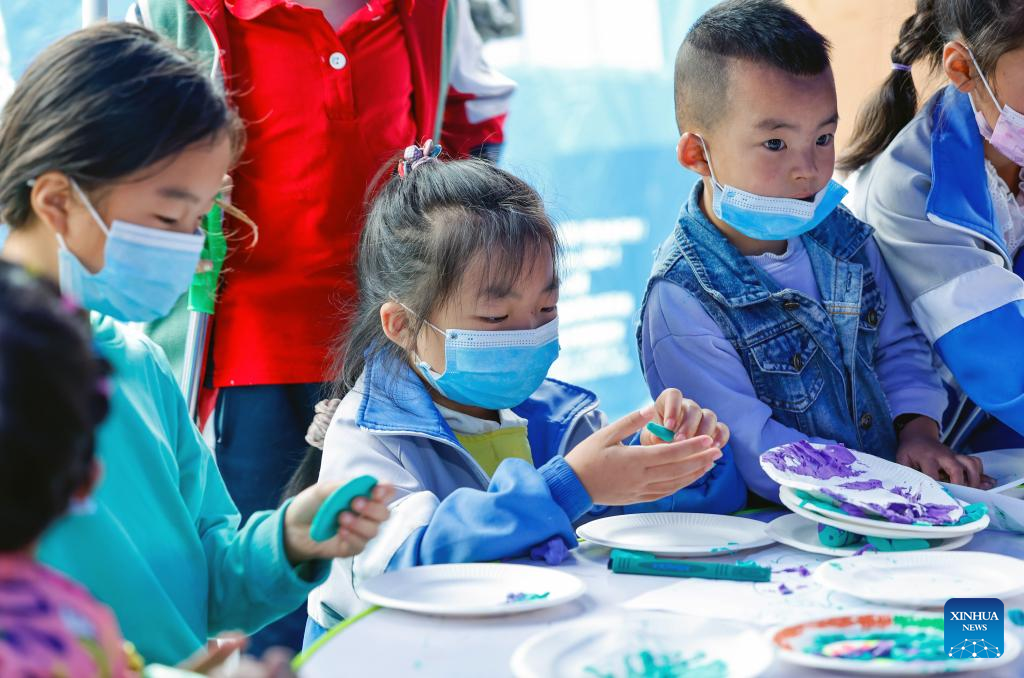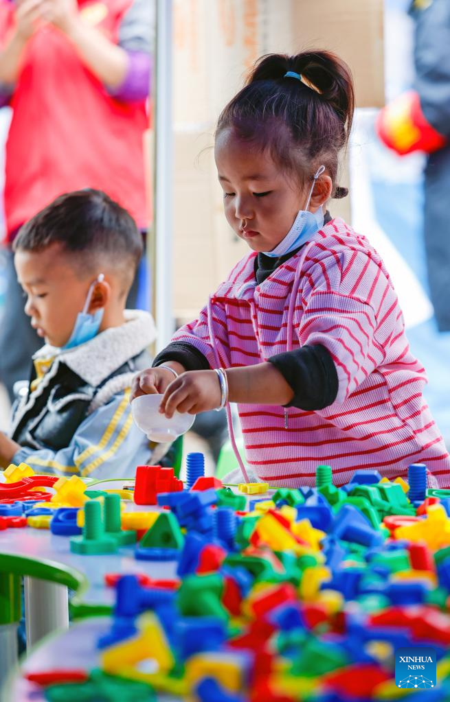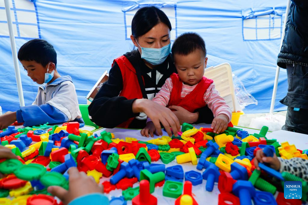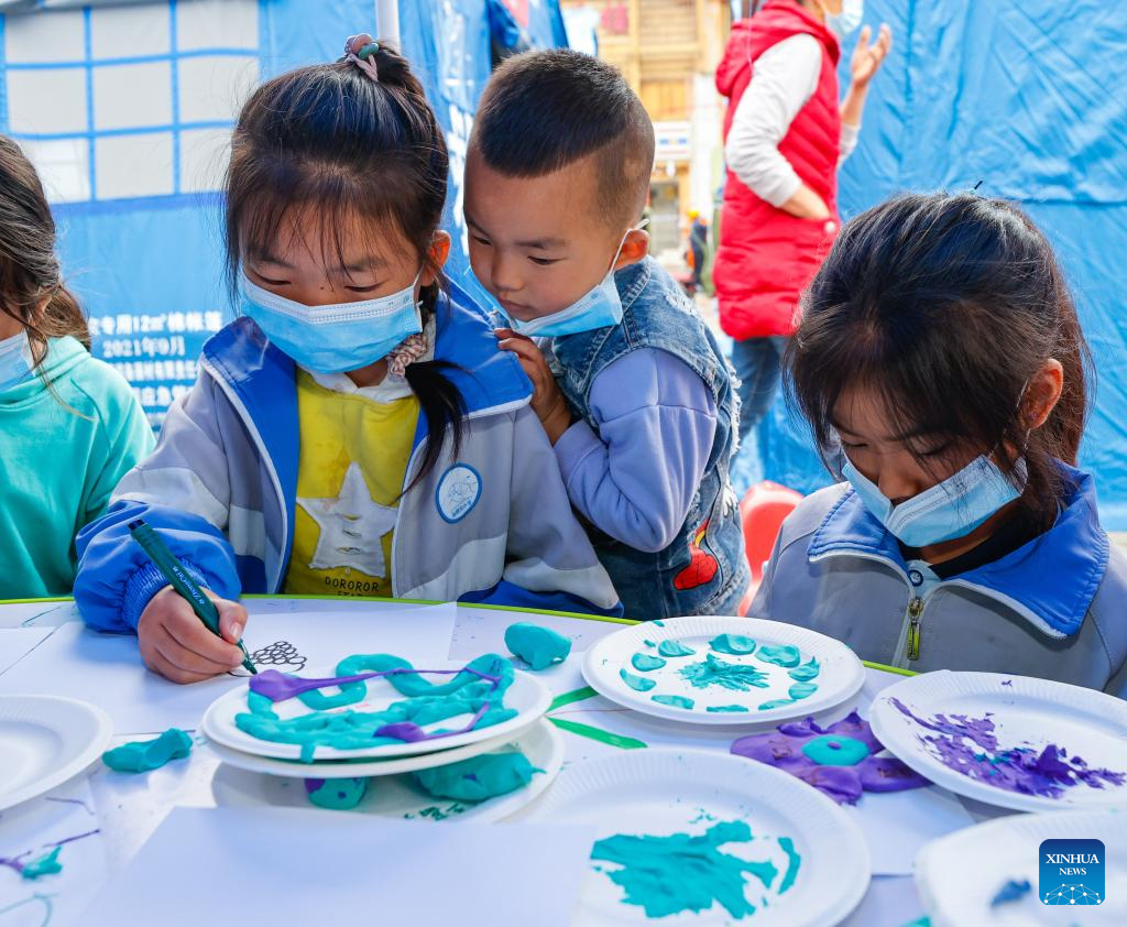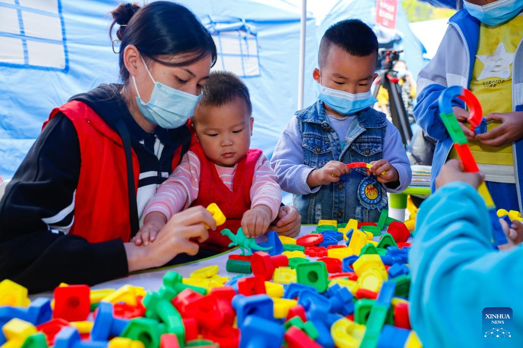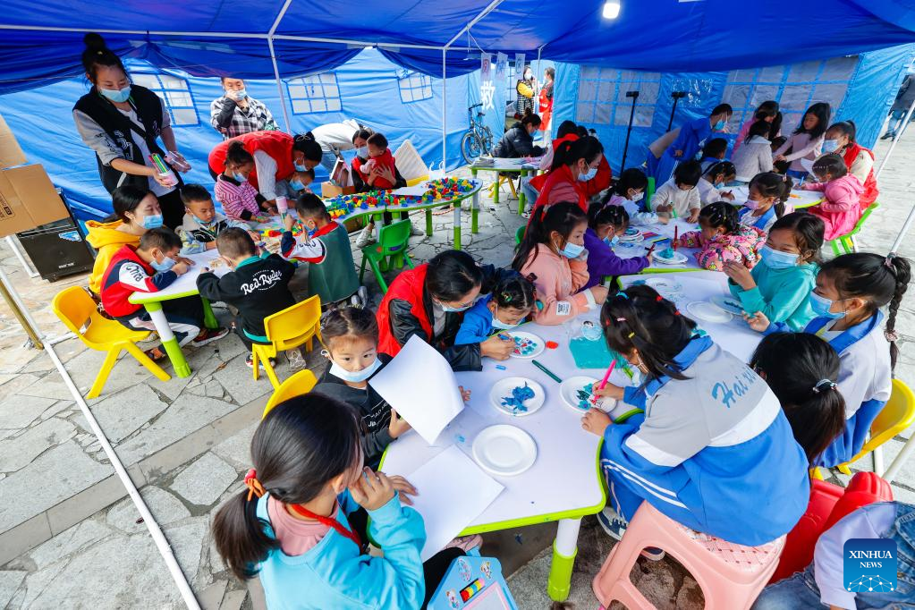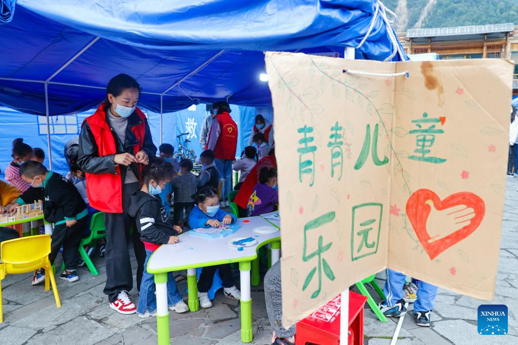 Children spend time at a children's center at a quake relief shelter in Moxi Town of Luding County, southwest China's Sichuan Province, Sept. 7, 2022. A children's center has been built up at a quake relief shelter in Moxi Town to take care of children affected by the earthquake. (Xinhua/Shen Bohan)