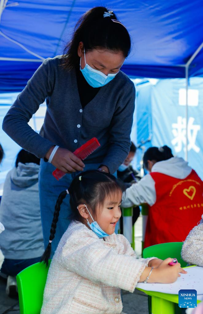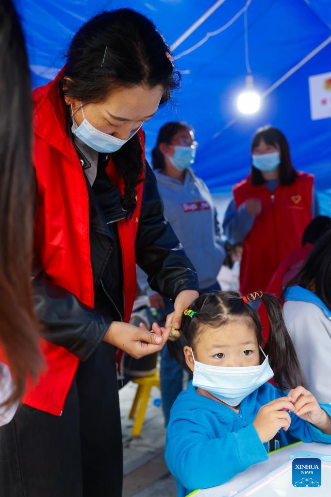 A volunteer combs hair for a little girl at a children's center at a quake relief shelter in Moxi Town of Luding County, southwest China's Sichuan Province, Sept. 7, 2022. A children's center has been built up at a quake relief shelter in Moxi Town to take care of children affected by the earthquake. (Xinhua/Shen Bohan)