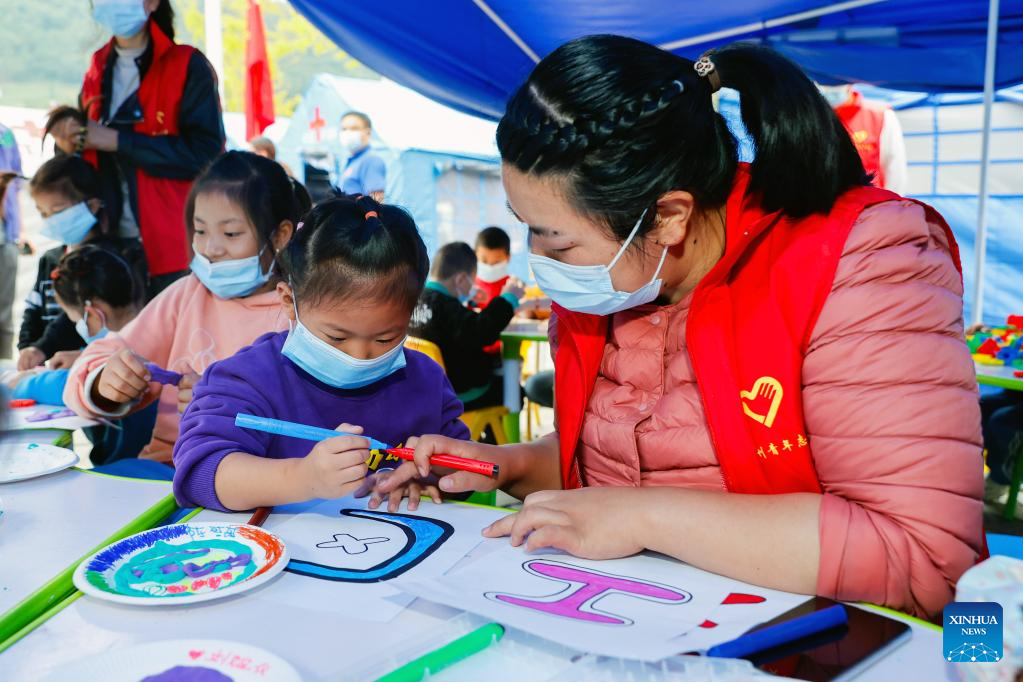 A girl draws pictures with a volunteer at a children's center at a quake relief shelter in Moxi Town of Luding County, southwest China's Sichuan Province, Sept. 7, 2022. A children's center has been built up at a quake relief shelter in Moxi Town to take care of children affected by the earthquake. (Xinhua/Shen Bohan)
