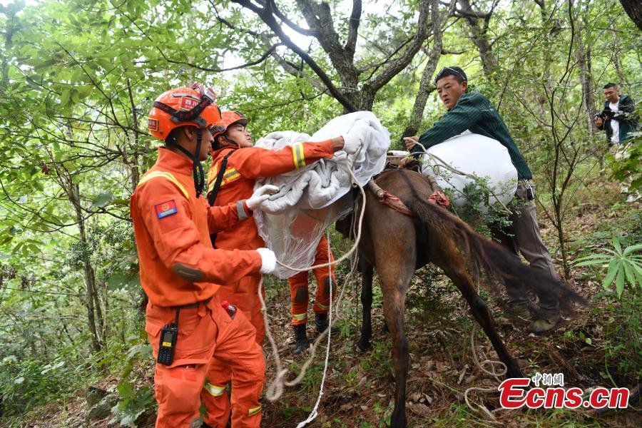 Rescuers carrying tents and relief materials walk to Moxi town of Luding county in Ganzi Tibetan autonomous prefecture, southwest China's Sichuan Province, Sept. 7, 2022. (Photo: China News Service/Zhang Lang)