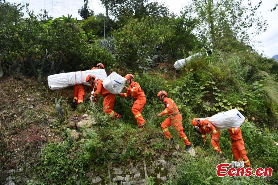 Rescuers carrying tents and relief materials walk to Moxi town of Luding county in Ganzi Tibetan autonomous prefecture, southwest China's Sichuan Province, Sept. 7, 2022. (Photo: China News Service/Zhang Lang)
