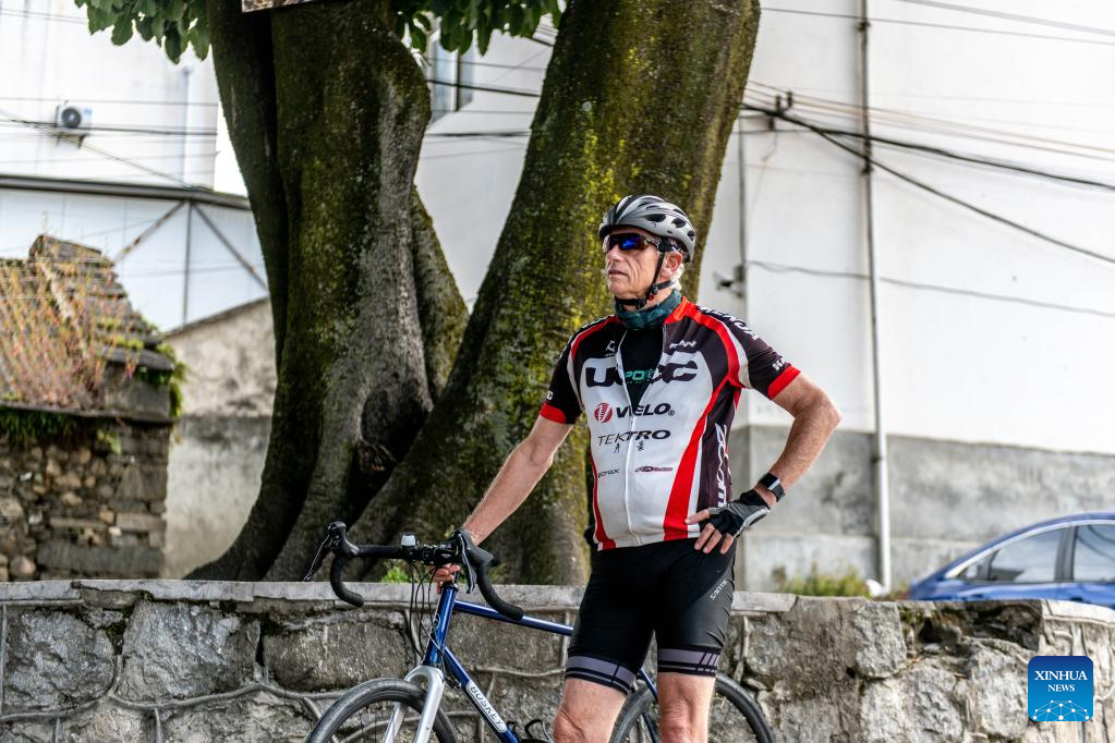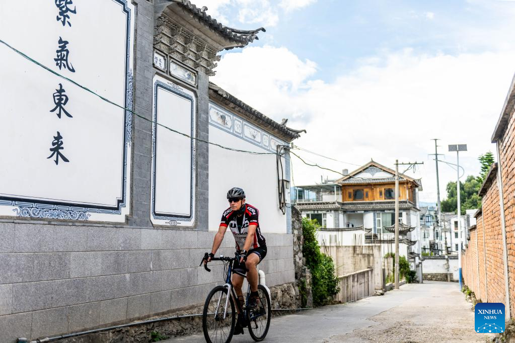 Jos Van der Wiel cycles in a village of Dali, southwest China's Yunnan Province, Aug. 29, 2022. It has been over 40 years since Jos Van der Wiel first came to China from the Netherlands. Over the decades, the Dutchman has grown fond of organizing tourists worldwide to travel around China by bicycle. During his bicycle tours, Jos got to know China well. He even compiled a China travel guidebook, offering a comprehensive guide to Dutch readers.