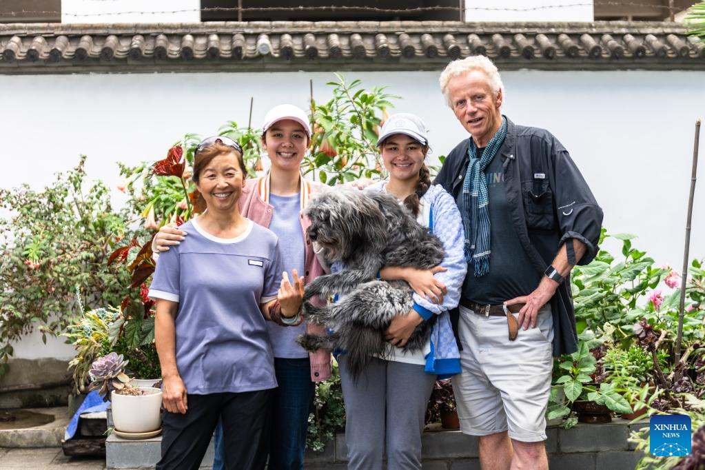 Jos Van der Wiel poses for photos with his family at home in Dali, southwest China's Yunnan Province, Aug. 29, 2022. It has been over 40 years since Jos Van der Wiel first came to China from the Netherlands. Over the decades, the Dutchman has grown fond of organizing tourists worldwide to travel around China by bicycle. During his bicycle tours, Jos got to know China well. He even compiled a China travel guidebook, offering a comprehensive guide to Dutch readers.