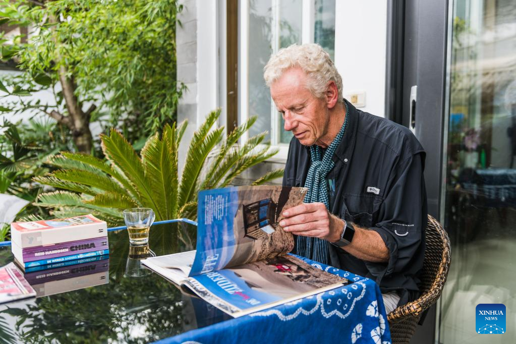 Jos Van der Wiel reads a magazine at home in Dali, southwest China's Yunnan Province, Aug. 29, 2022. It has been over 40 years since Jos Van der Wiel first came to China from the Netherlands. Over the decades, the Dutchman has grown fond of organizing tourists worldwide to travel around China by bicycle. During his bicycle tours, Jos got to know China well. He even compiled a China travel guidebook, offering a comprehensive guide to Dutch readers.