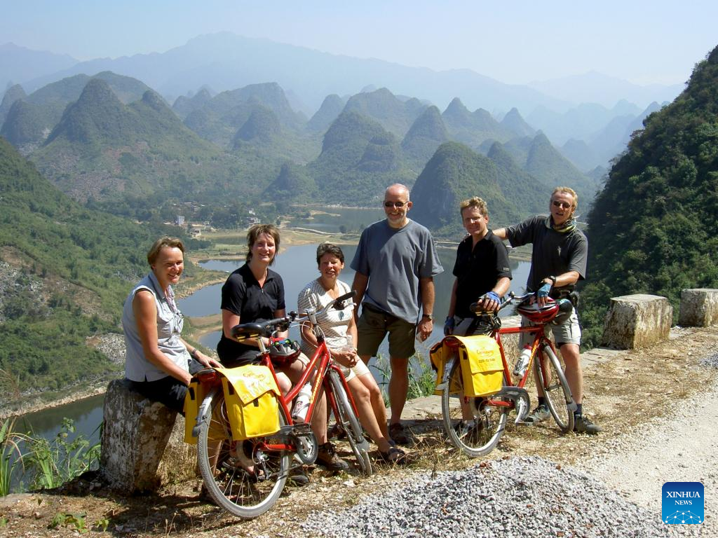 In this photo provided by Jos Van der Wiel (1st R), he poses for photos with cyclists during a bike tour in Yangshuo County of Guilin, south China's Guangxi Zhuang Autonomous Region. It has been over 40 years since Jos Van der Wiel first came to China from the Netherlands. Over the decades, the Dutchman has grown fond of organizing tourists worldwide to travel around China by bicycle. During his bicycle tours, Jos got to know China well. He even compiled a China travel guidebook, offering a comprehensive guide to Dutch readers.