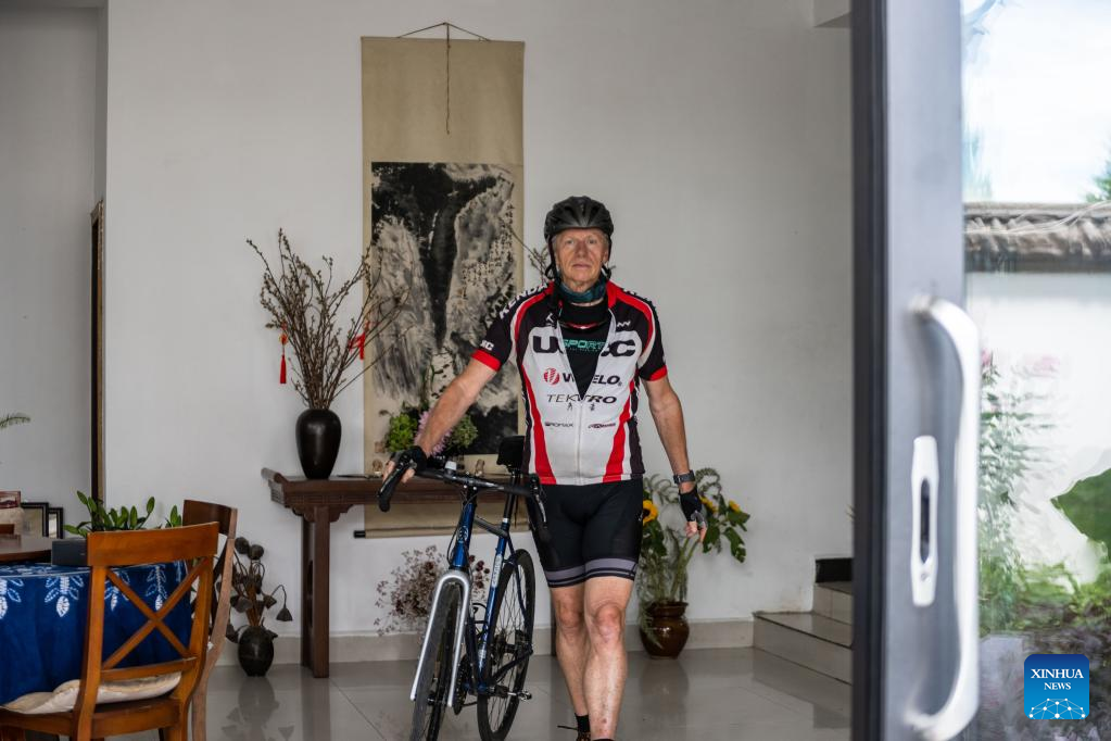 Jos Van der Wiel gets ready for a bicycle outing in Dali, southwest China's Yunnan Province, Aug. 29, 2022. It has been over 40 years since Jos Van der Wiel first came to China from the Netherlands. Over the decades, the Dutchman has grown fond of organizing tourists worldwide to travel around China by bicycle. During his bicycle tours, Jos got to know China well. He even compiled a China travel guidebook, offering a comprehensive guide to Dutch readers.
