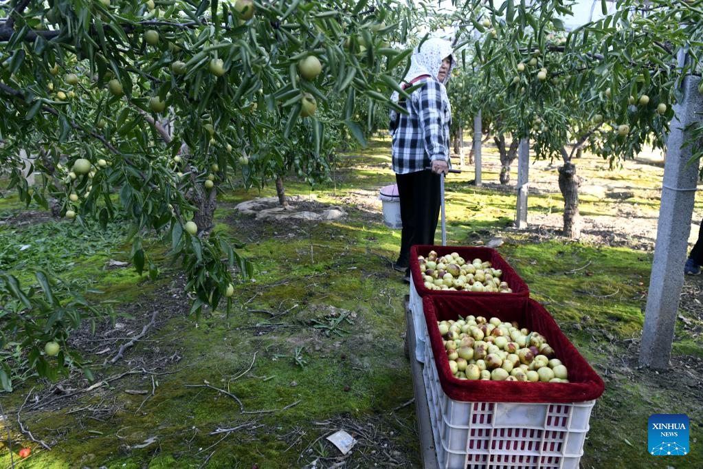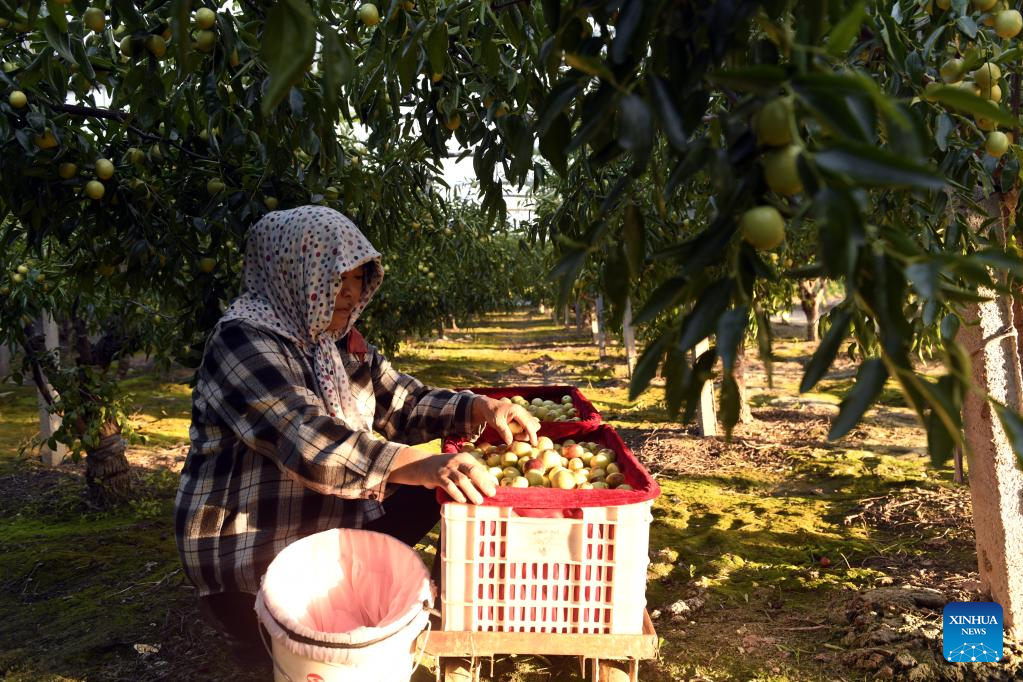 A worker moves just-harvested jujube dates at a jujube date demonstration park in Zhanhua District of Binzhou, east China's Shandong Province, Sept. 6, 2022. Greenhouse jujube date planting has proved to be an effective way to bring more income to local farmers. (Xinhua/Fan Changguo)