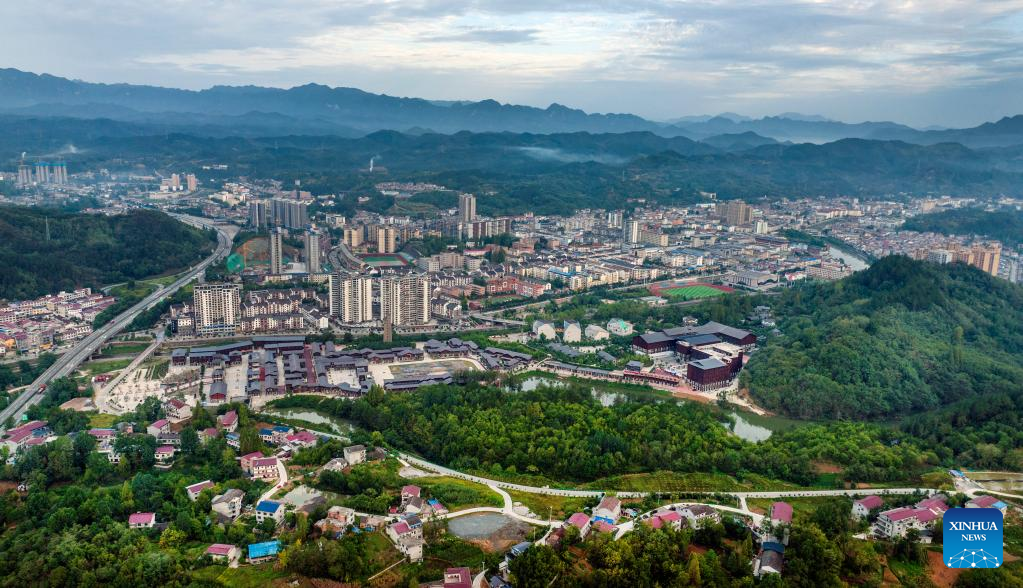 Aerial photo taken on Sept. 6, 2022 shows a view of Ningqiang County, northwest China's Shaanxi Province. As the headwater region of the Hanjiang River, the largest tributary of the Yangtze River, Ningqiang County has closed ten mines and promoted a series of ecological protection projects for environmental protection in recent years. The county has also promoted the production of agricultural products including tea, fruits, vegetables, etc., managing and transforming ecological resources to green economy. (Xinhua/Tao Ming)