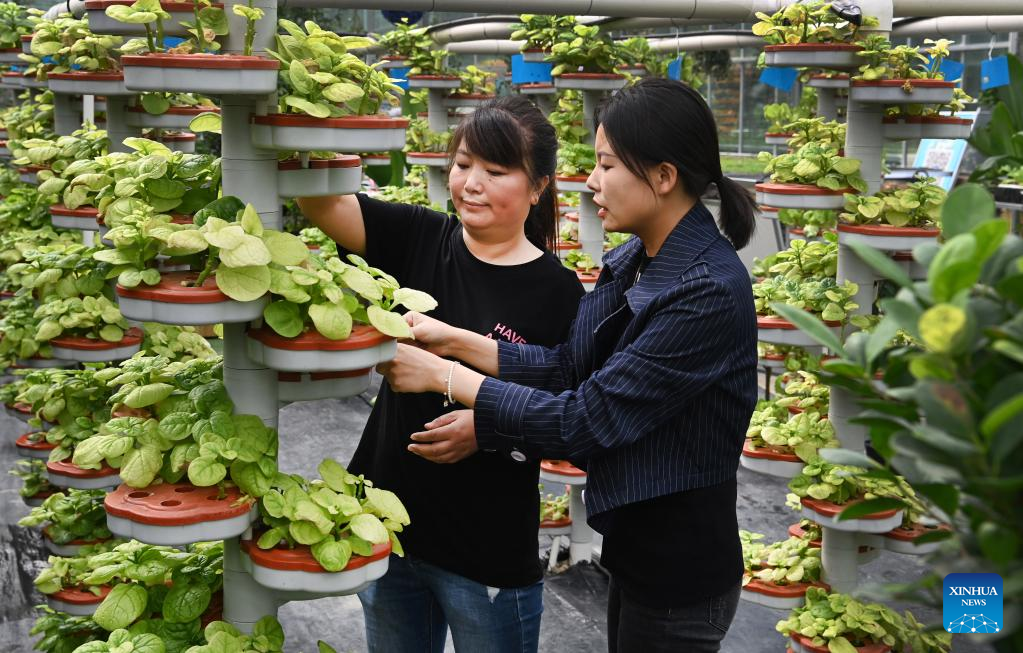 Staff members take care of soilless vegetables in Ningqiang County, northwest China's Shaanxi Province, Sept. 7, 2022. As the headwater region of the Hanjiang River, the largest tributary of the Yangtze River, Ningqiang County has closed ten mines and promoted a series of ecological protection projects for environmental protection in recent years. The county has also promoted the production of agricultural products including tea, fruits, vegetables, etc., managing and transforming ecological resources to green economy. (Xinhua/Tao Ming)
