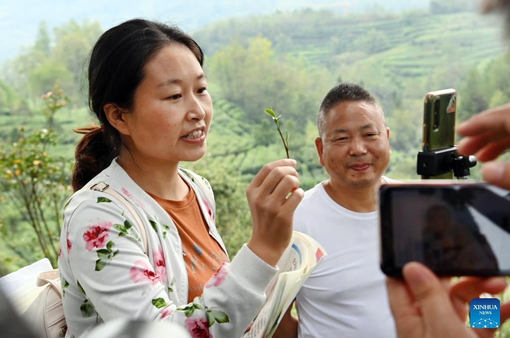 Yang Xiaoying (L) promotes tea products through live-streaming at a tea garden in Ningqiang County, northwest China's Shaanxi Province, Sept. 7, 2022. As the headwater region of the Hanjiang River, the largest tributary of the Yangtze River, Ningqiang County has closed ten mines and promoted a series of ecological protection projects for environmental protection in recent years. The county has also promoted the production of agricultural products including tea, fruits, vegetables, etc., managing and transforming ecological resources to green economy. (Xinhua/Tao Ming)