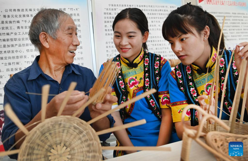 Tong Zhengming (1st L), an intangible cultural heritage inheritor, displays bamboo weaving techniques of Qiang ethnic group at a folk custom garden in Ningqiang County, northwest China's Shaanxi Province, Sept. 7, 2022. As the headwater region of the Hanjiang River, the largest tributary of the Yangtze River, Ningqiang County has closed ten mines and promoted a series of ecological protection projects for environmental protection in recent years. The county has also promoted the production of agricultural products including tea, fruits, vegetables, etc., managing and transforming ecological resources to green economy. (Xinhua/Tao Ming)