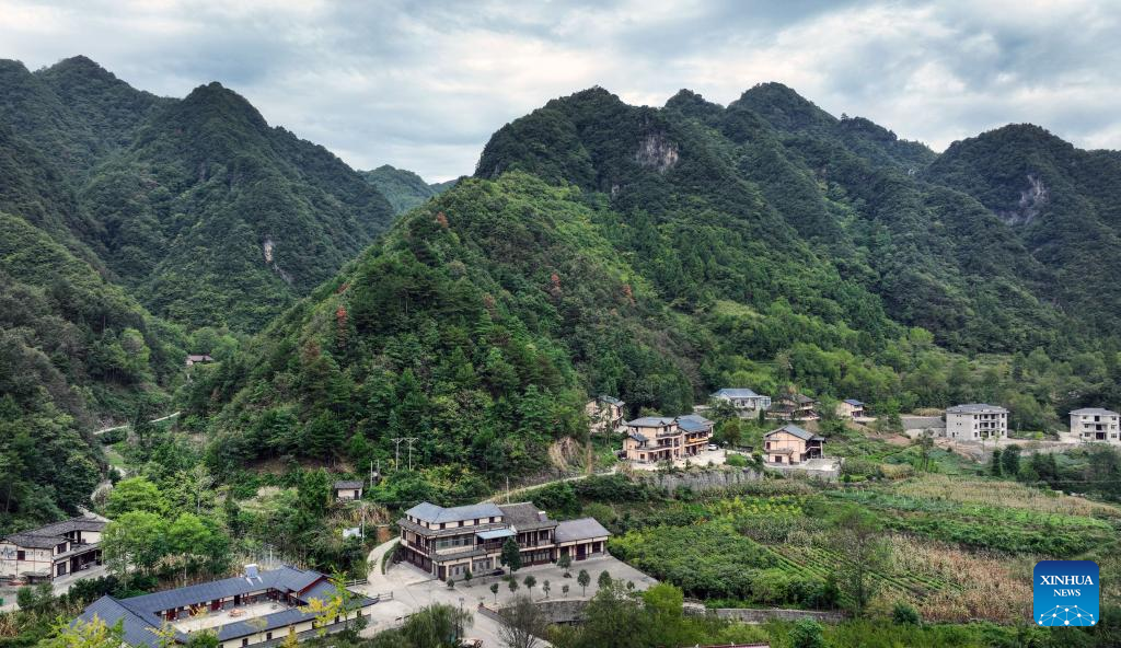 Aerial photo taken on Sept. 6, 2022 shows rural houses in Hanshuiyuan Village in Ningqiang County, northwest China's Shaanxi Province. As the headwater region of the Hanjiang River, the largest tributary of the Yangtze River, Ningqiang County has closed ten mines and promoted a series of ecological protection projects for environmental protection in recent years. The county has also promoted the production of agricultural products including tea, fruits, vegetables, etc., managing and transforming ecological resources to green economy. (Xinhua/Tao Ming)