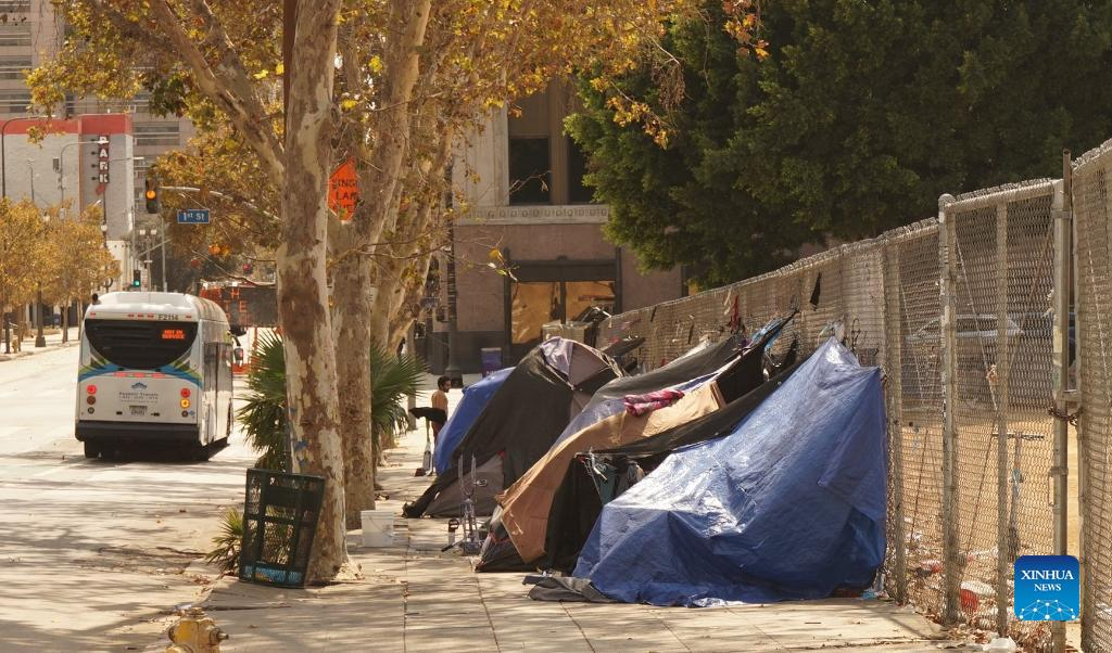 Tents housing the homeless line the sidewalk of a street in downtown Los Angeles, California, the United States, on Sept. 8, 2022. An estimated 69,144 people are experiencing homelessness in Los Angeles, the most populous county in the United States, according to the results of the 2022 Homeless Count released by the Los Angeles Homeless Services Authority (LAHSA) on Thursday. (Photo by Zeng Hui/Xinhua).