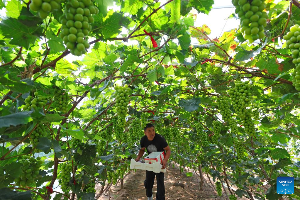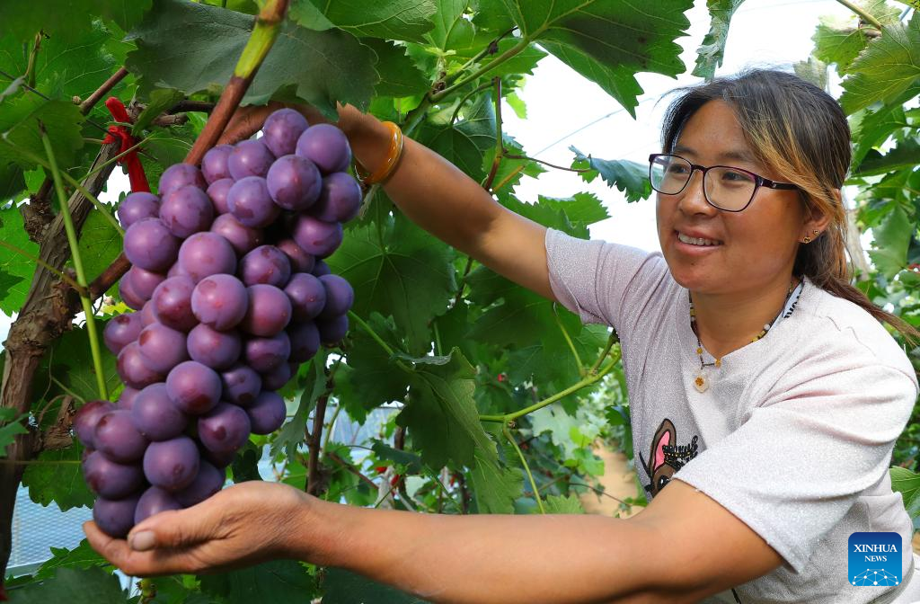 A farmer harvests grapes at a greenhouse in Dingjiafang Town of Faku County in Shenyang, northeast China's Liaoning Province, Sept. 6, 2022. More than 3,500 mu (about 233 hectares) of grapes in Dingjiafang Town have entered the harvest season recently. (Xinhua/Yang Qing)