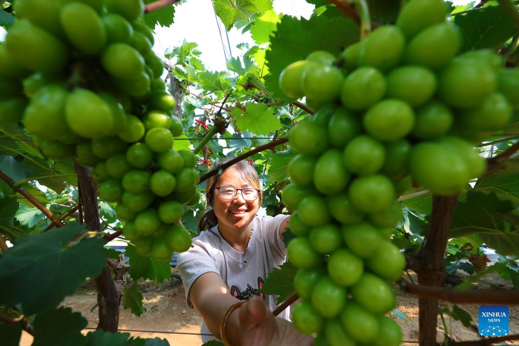 A farmer checks grapes at a greenhouse in Dingjiafang Town of Faku County in Shenyang, northeast China's Liaoning Province, Sept. 6, 2022. More than 3,500 mu (about 233 hectares) of grapes in Dingjiafang Town have entered the harvest season recently. (Xinhua/Yang Qing)