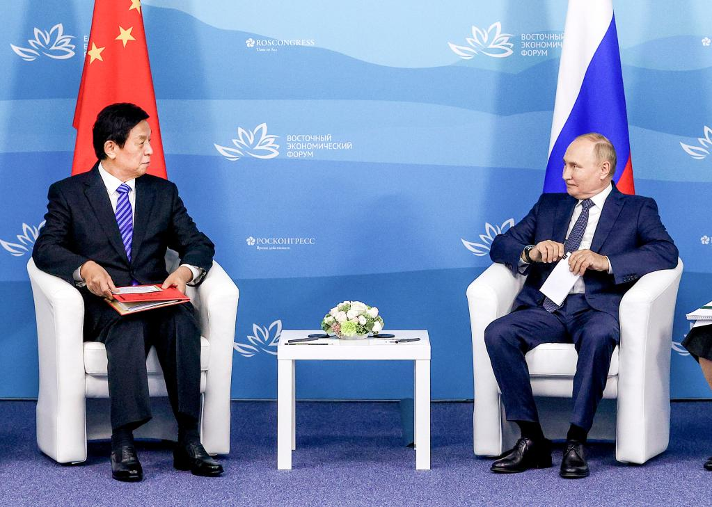 Li Zhanshu, chairman of China's National People's Congress (NPC) Standing Committee, meets with Russian President Vladimir Putin in Russia's far eastern city of Vladivostok, Sept. 7, 2022. Li paid an official goodwill visit to Russia from Wednesday to Saturday at the invitation of Chairman of the Russian State Duma Vyacheslav Volodin. (Xinhua)