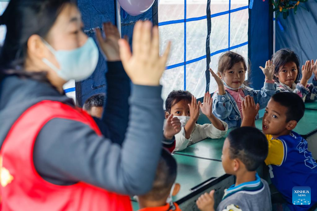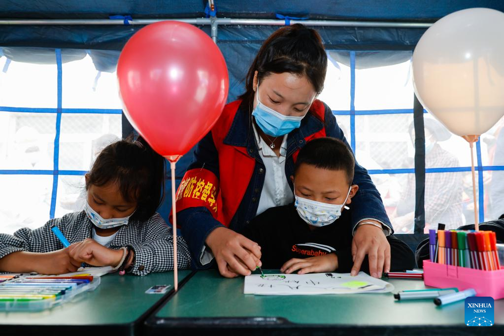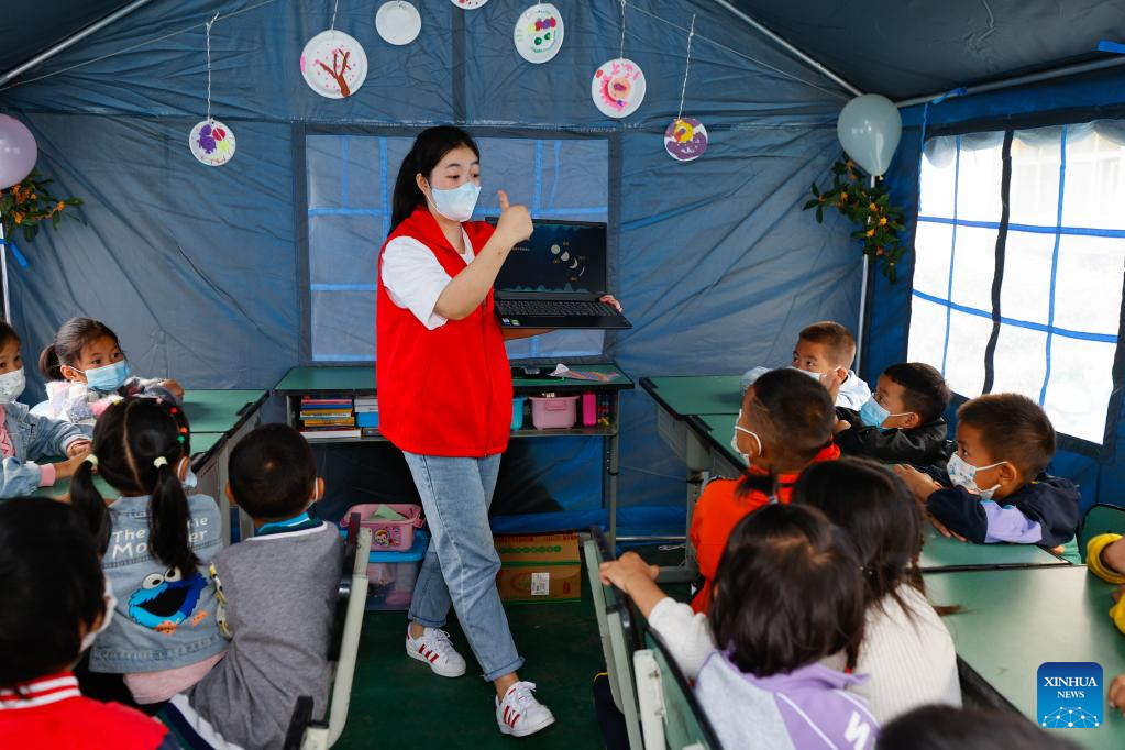 Volunteer Gu Xiaoxin gives a lesson in a "tent classroom" at the quake relief shelter of Luding No. 2 high school in Luding, southwest China's Sichuan Province, Sept. 10, 2022. After a 6.8-magnitude earthquake jolted Luding County in southwest China's Sichuan Province on Monday, more than 800 villagers in Detuo Town, including about 50 children, were temporarily relocated in Luding No. 2 high school. Since September 6th, 11 teachers from Luding's kindergartens and 10 college and high school students have volunteered to take care of these children. These volunteers bought balloons, stickers, stationery and other supplies, and changed three tents into classrooms where volunteers accompanied children to draw pictures, play games and make creative "mooncakes" to spend the Mid-Autumn festival on September 10th, which is also China's Teachers' Day. Later, volunteers will continue to take care of these children and tutor them in those "tent classrooms". (Xinhua/Shen Bohan)
