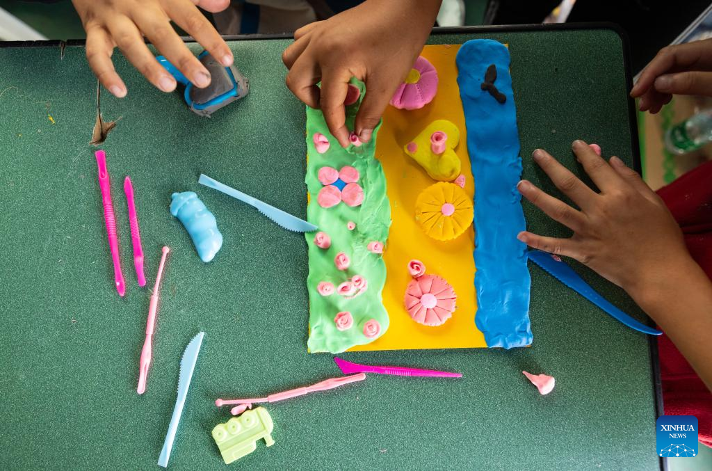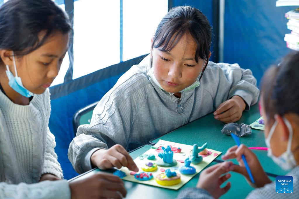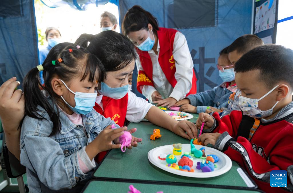 Children from Detuo town make creative "mooncakes" with plasticine at the quake relief shelter of Luding No. 2 high school in Luding, southwest China's Sichuan Province, Sept. 10, 2022. After a 6.8-magnitude earthquake jolted Luding County in southwest China's Sichuan Province on Monday, more than 800 villagers in Detuo Town, including about 50 children, were temporarily relocated in Luding No. 2 high school. Since September 6th, 11 teachers from Luding's kindergartens and 10 college and high school students have volunteered to take care of these children. These volunteers bought balloons, stickers, stationery and other supplies, and changed three tents into classrooms where volunteers accompanied children to draw pictures, play games and make creative "mooncakes" to spend the Mid-Autumn festival on September 10th, which is also China's Teachers' Day. Later, volunteers will continue to take care of these children and tutor them in those "tent classrooms". (Xinhua/Shen Bohan)