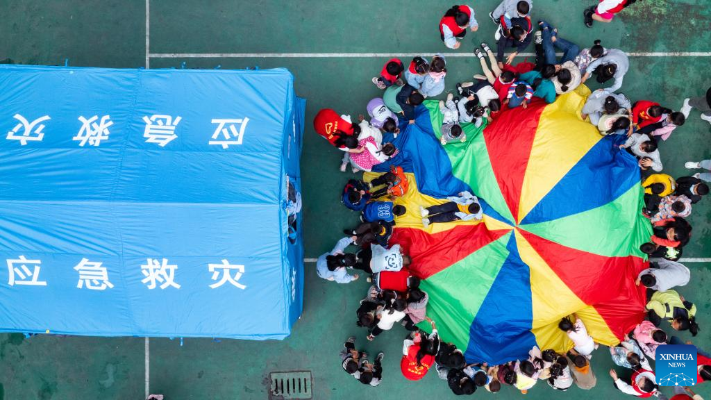 Aerial photo taken on Sept. 10, 2022 shows children and volunteers playing games at the quake relief shelter of Luding No. 2 high school in Luding, southwest China's Sichuan Province. After a 6.8-magnitude earthquake jolted Luding County in southwest China's Sichuan Province on Monday, more than 800 villagers in Detuo Town, including about 50 children, were temporarily relocated in Luding No. 2 high school. Since September 6th, 11 teachers from Luding's kindergartens and 10 college and high school students have volunteered to take care of these children. These volunteers bought balloons, stickers, stationery and other supplies, and changed three tents into classrooms where volunteers accompanied children to draw pictures, play games and make creative "mooncakes" to spend the Mid-Autumn festival on September 10th, which is also China's Teachers' Day. Later, volunteers will continue to take care of these children and tutor them in those "tent classrooms". (Xinhua/Shen Bohan)