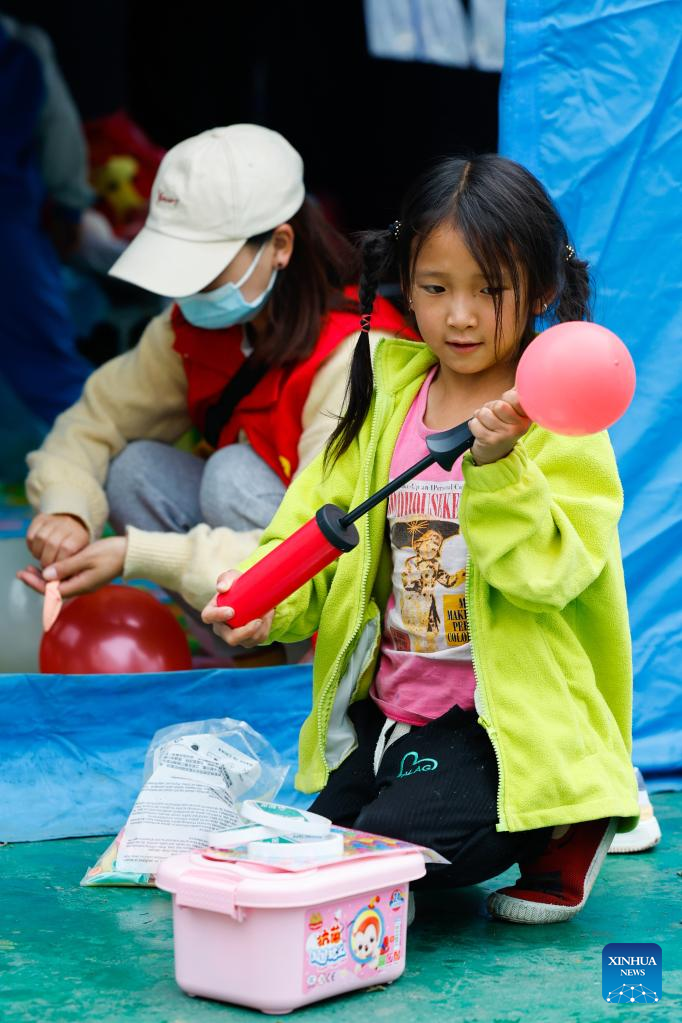 A child from Detuo town helps volunteers blow up balloons at the quake relief shelter of Luding No. 2 high school in Luding, southwest China's Sichuan Province, Sept. 10, 2022. After a 6.8-magnitude earthquake jolted Luding County in southwest China's Sichuan Province on Monday, more than 800 villagers in Detuo Town, including about 50 children, were temporarily relocated in Luding No. 2 high school. Since September 6th, 11 teachers from Luding's kindergartens and 10 college and high school students have volunteered to take care of these children. These volunteers bought balloons, stickers, stationery and other supplies, and changed three tents into classrooms where volunteers accompanied children to draw pictures, play games and make creative "mooncakes" to spend the Mid-Autumn festival on September 10th, which is also China's Teachers' Day. Later, volunteers will continue to take care of these children and tutor them in those "tent classrooms". (Xinhua/Shen Bohan)