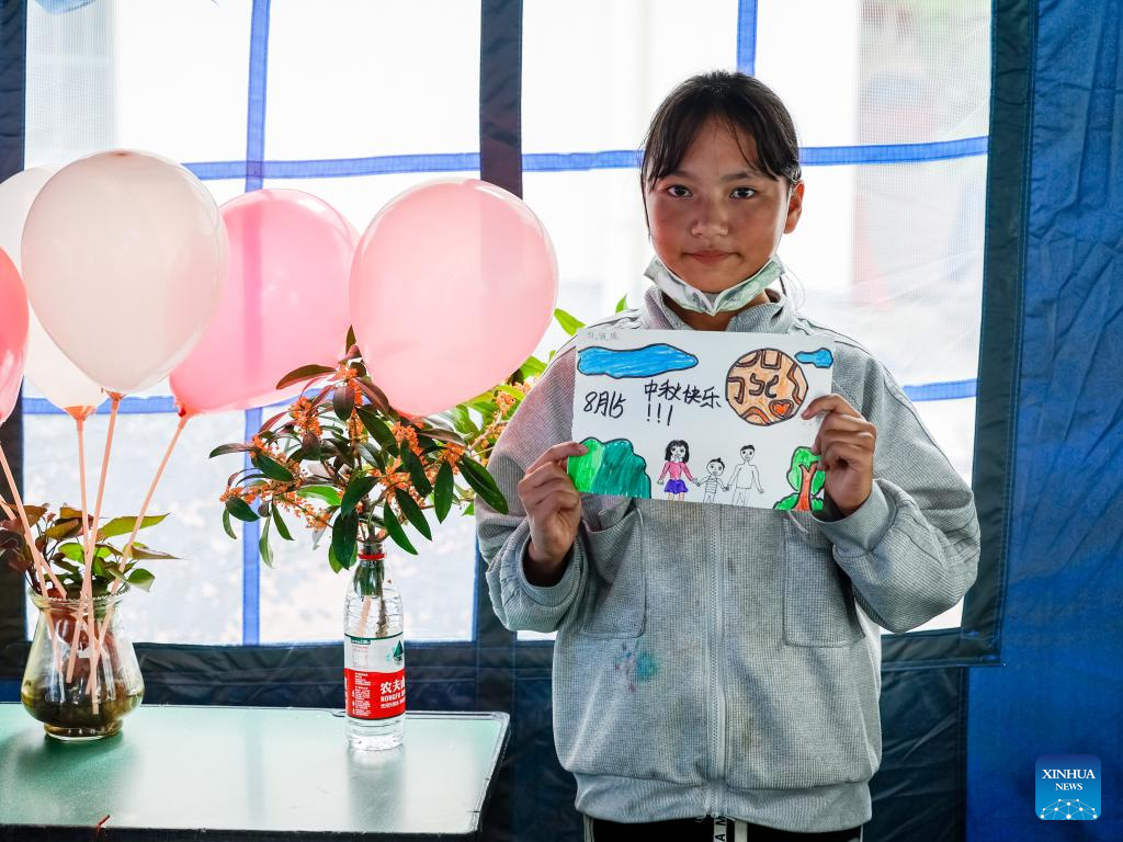 Ni Peiyao, a 10-year-old girl from Detuo town, shows a painting she drew in a "tent classroom" at the quake relief shelter of Luding No. 2 high School in Luding, southwest China's Sichuan Province, Sept. 10, 2022. After a 6.8-magnitude earthquake jolted Luding County in southwest China's Sichuan Province on Monday, more than 800 villagers in Detuo Town, including about 50 children, were temporarily relocated in Luding No. 2 high school. Since September 6th, 11 teachers from Luding's kindergartens and 10 college and high school students have volunteered to take care of these children. These volunteers bought balloons, stickers, stationery and other supplies, and changed three tents into classrooms where volunteers accompanied children to draw pictures, play games and make creative "mooncakes" to spend the Mid-Autumn festival on September 10th, which is also China's Teachers' Day. Later, volunteers will continue to take care of these children and tutor them in those "tent classrooms". (Xinhua/Shen Bohan)