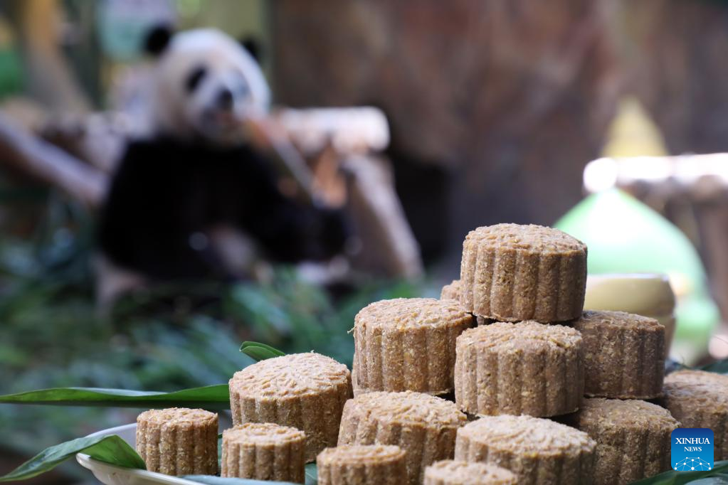 Photo taken on Sept. 9, 2022 shows the specially-made "mooncakes" for giant panda triplets at the Chimelong Safari Park in Guangzhou, south China's Guangdong Province. Giant panda triplets "Mengmeng", "Shuaishuai" and "Kuku" were served special "mooncakes" made from bamboo shoots and fruits at the Chimelong Safari Park in Guangzhou on Friday, as a way to celebrate the Mid-Autumn Festival, which falls on Sept. 10 this year. (Xinhua/Huang Guobao)