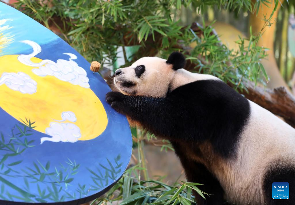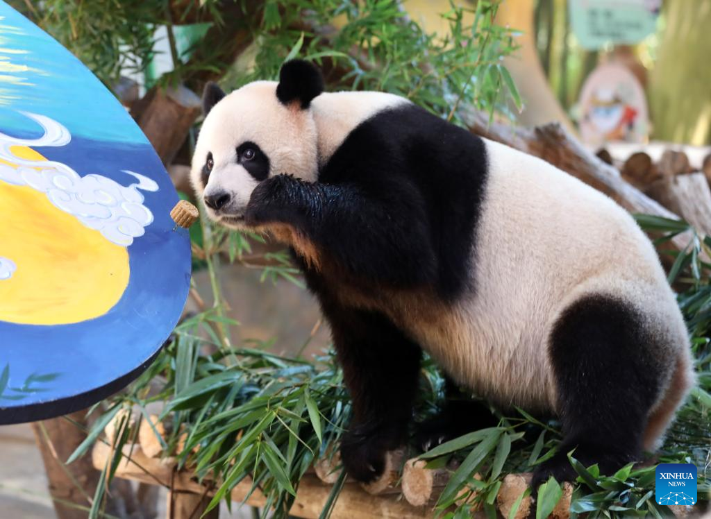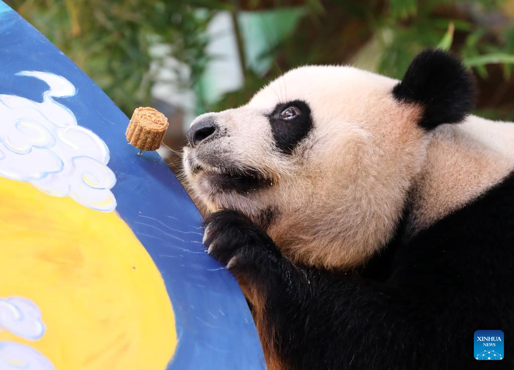 Giant panda "Kuku" eats the specially-made "mooncake" at the Chimelong Safari Park in Guangzhou, south China's Guangdong Province, Sept. 9, 2022. Giant panda triplets "Mengmeng", "Shuaishuai" and "Kuku" were served special "mooncakes" made from bamboo shoots and fruits at the Chimelong Safari Park in Guangzhou on Friday, as a way to celebrate the Mid-Autumn Festival, which falls on Sept. 10 this year. (Xinhua/Huang Guobao)