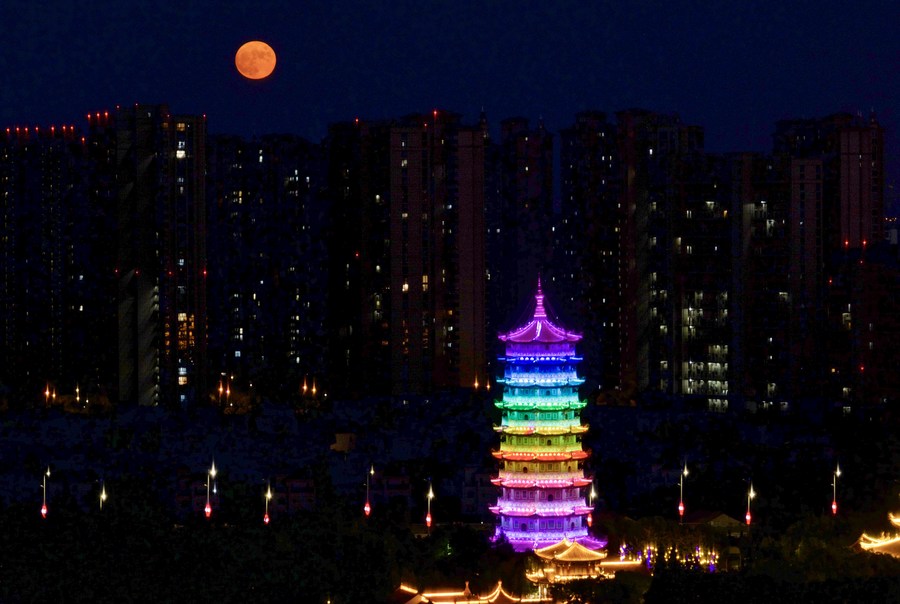 In southwest China's Chongqing Municipality, colorful "jade rabbit" lights and a gigantic moon-shaped light lit up the hilltop observation deck at Longmenhao old street.