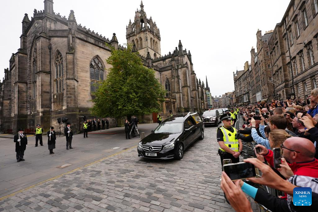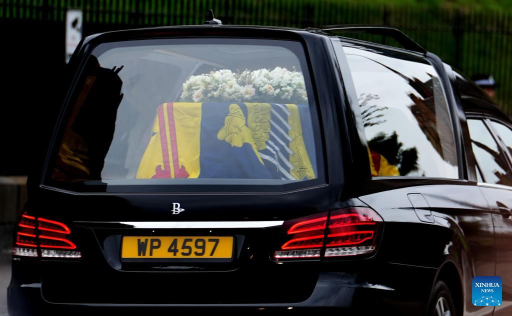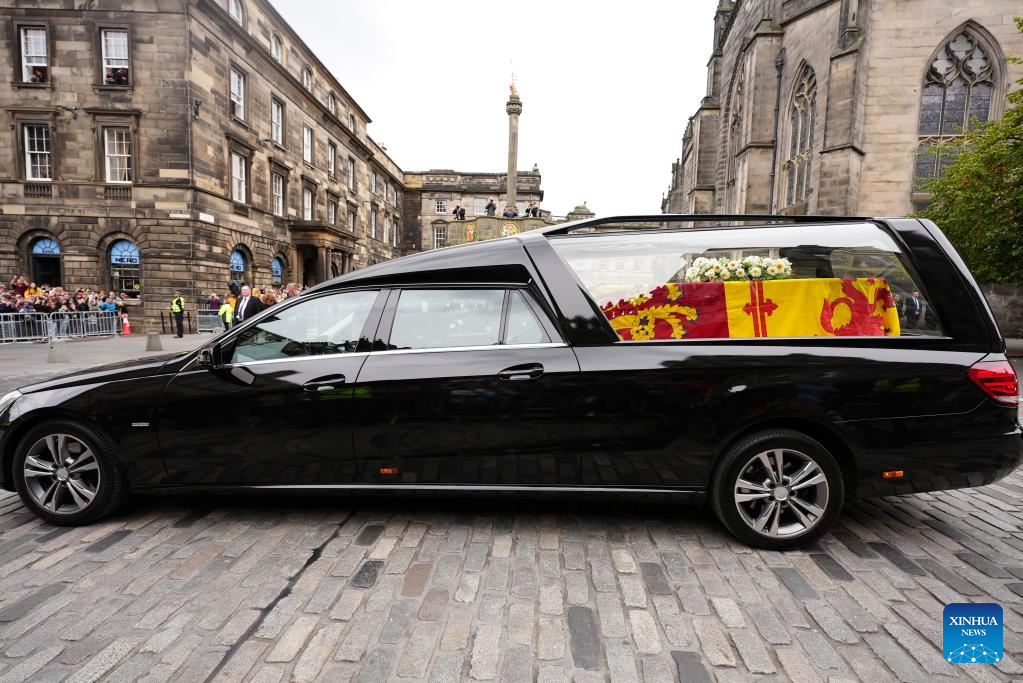 The hearse carrying the coffin of Queen Elizabeth II is seen in Edinburgh, Britain, Sept. 11, 2022. The hearse carrying the body of Queen Elizabeth II left Balmoral Castle and arrived at Edinburgh on Sunday. (Photo by Zhang Ruijun/Xinhua)