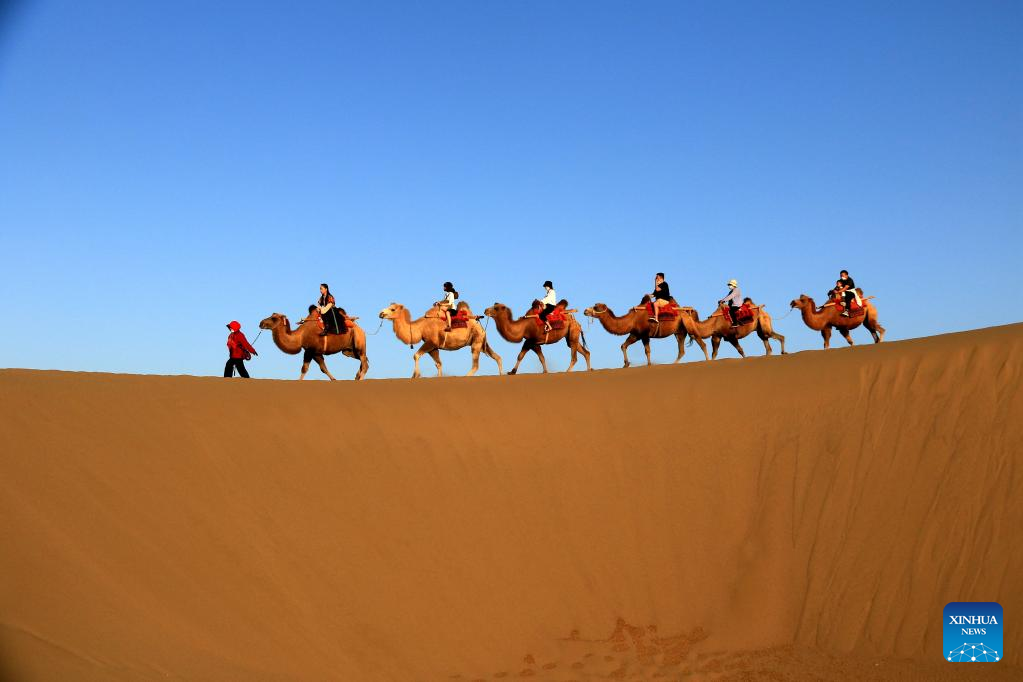 Tourists ride on camels during Mid-Autumn Festival holiday at Mingsha Mountain and Crescent Spring scenic spot in Dunhuang City, northwest China's Gansu Province, Sept. 10, 2022. (Photo by Zhang Xiaoliang/Xinhua)