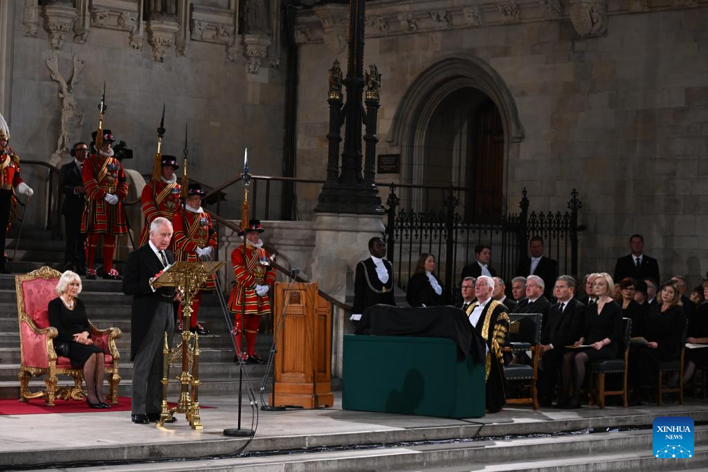 Britain's King Charles III (L, front) delivers his first address to the parliament in Westminster Hall in London, Britain, Sept. 12, 2022. Britain's King Charles III said he felt "the weight of history" and vowed to follow the example set by his late mother, Queen Elizabeth II, in his first address to the parliament on Monday. (Jessica Taylor/UK Parliament/Handout via Xinhua)