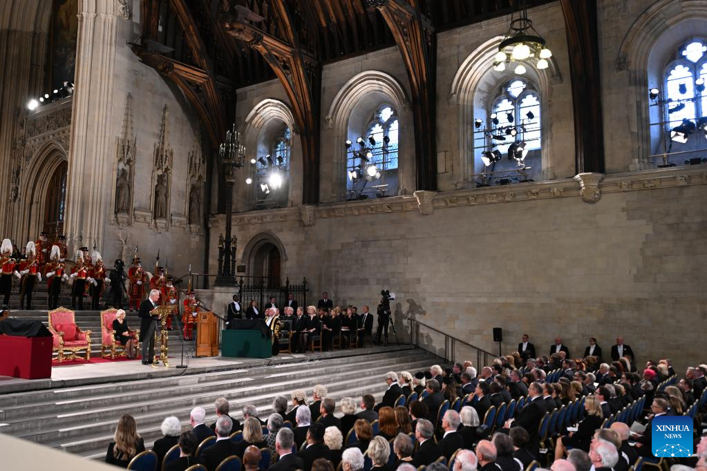 Britain's King Charles III (on the podium) delivers his first address to the parliament in Westminster Hall in London, Britain, Sept. 12, 2022. Britain's King Charles III said he felt "the weight of history" and vowed to follow the example set by his late mother, Queen Elizabeth II, in his first address to the parliament on Monday. (Jessica Taylor/UK Parliament/Handout via Xinhua)