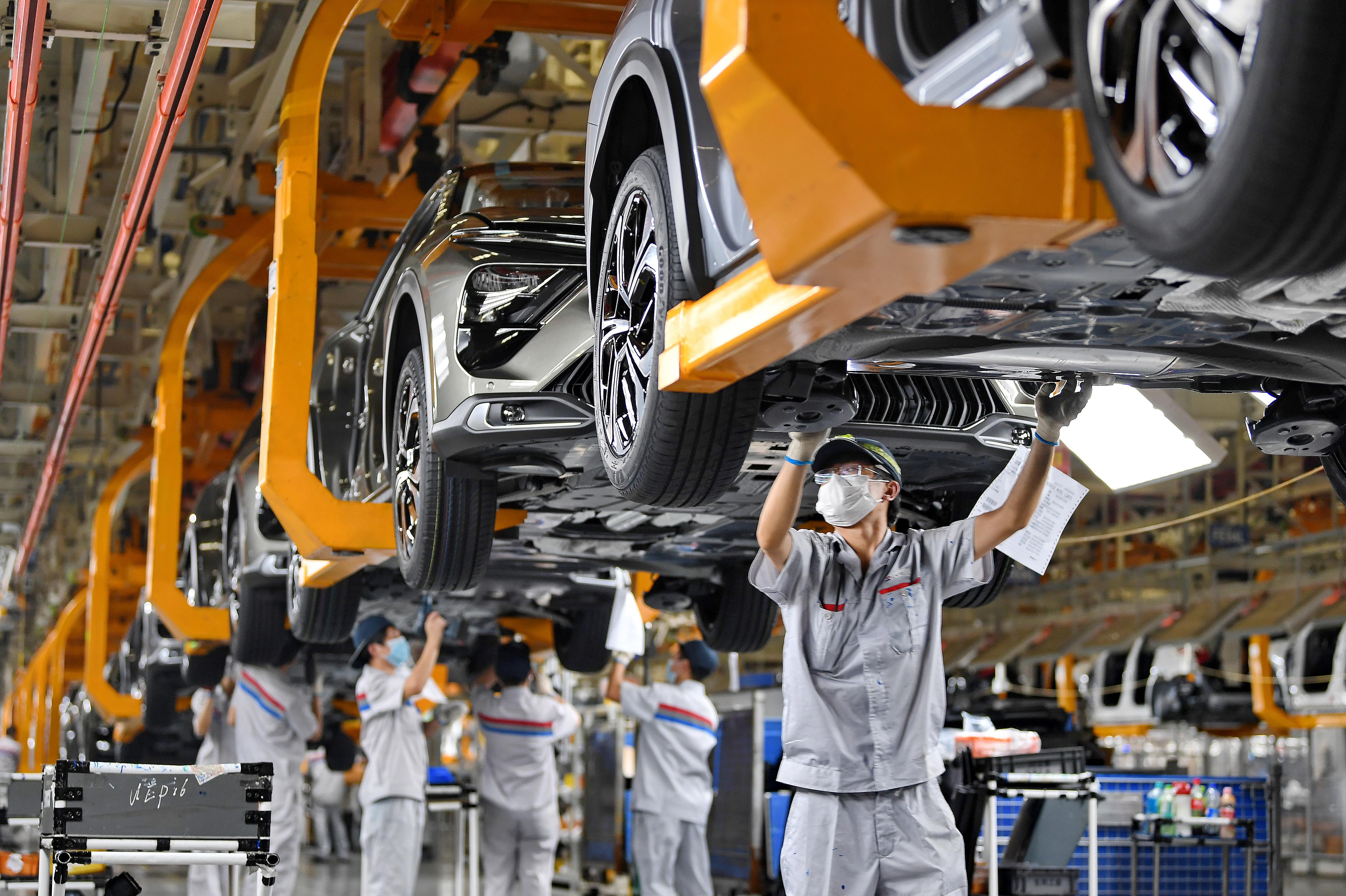 Employees work on the production line of an automaker in Chengdu, Sichuan province. [Photo by Li Xiangyu/for China Daily]